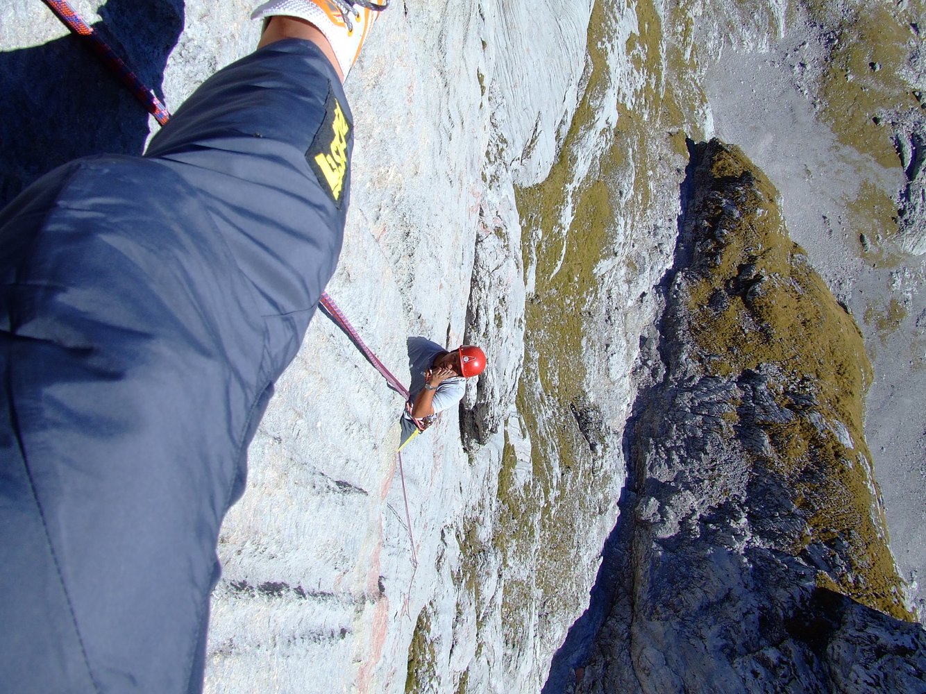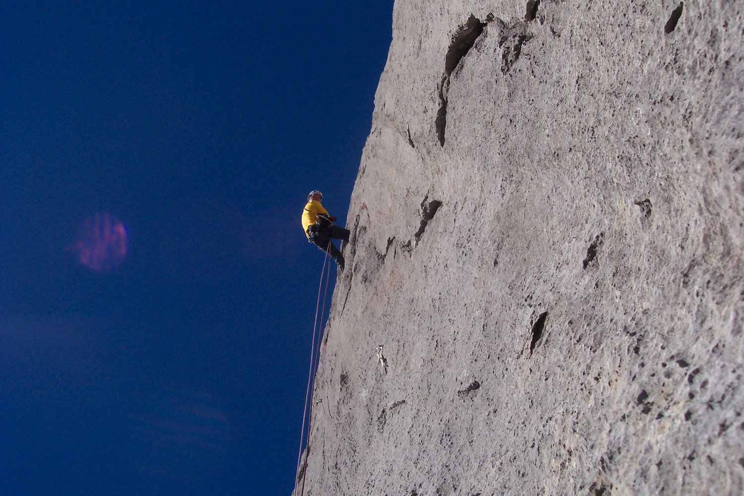 Über die Route Glasperlenspiel 5 mal mit Doppelseil bis zum Schneerest in die Rinne abseilen und auf der linken Seite der Rinne absteigen.
