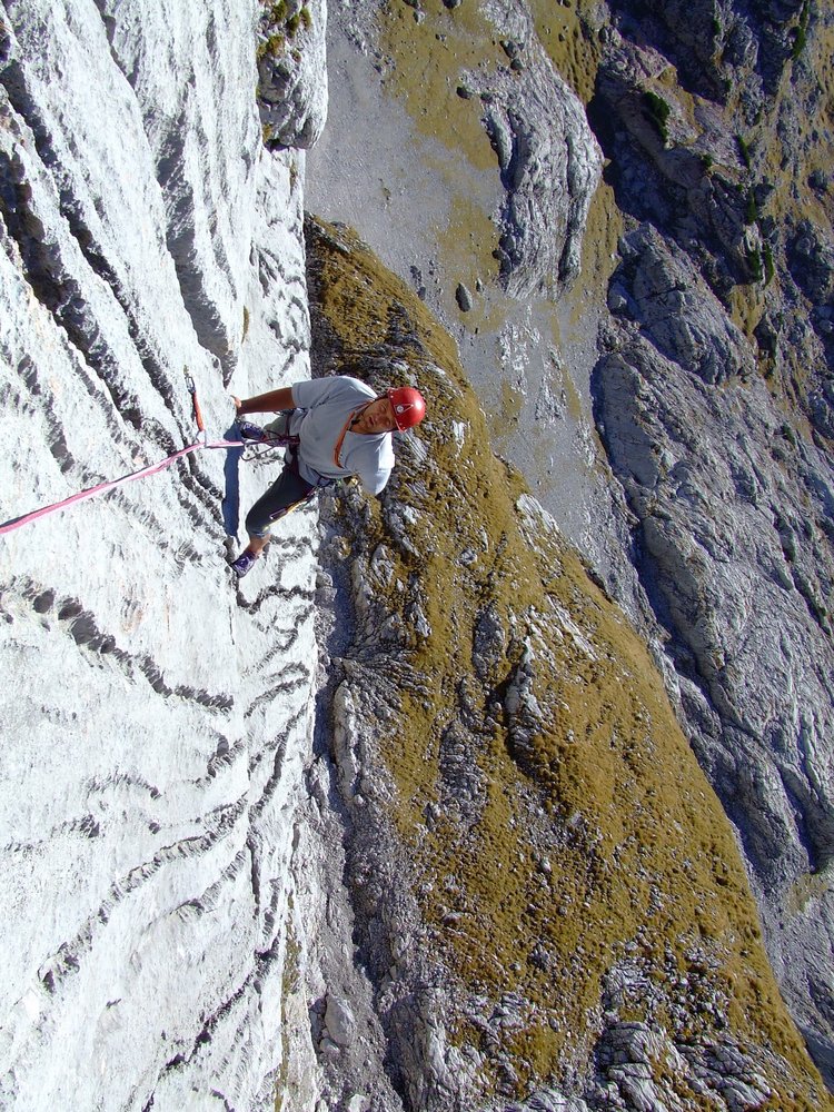 Nette und höchst genußvolle Kletterei über kompakte mittelsteile Platten mit zahlreichen Wasserrillen in bestem Hochkönigkalk. Die Route wurde von unten durchstiegen. Alle Bohrhaken wurden aus der Kletterstellung gesetzt.