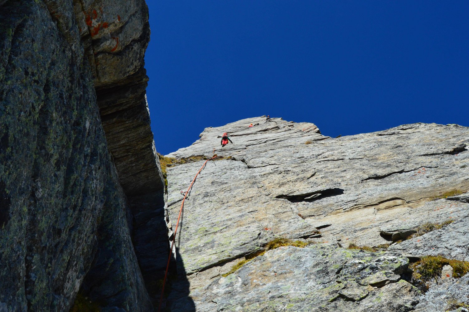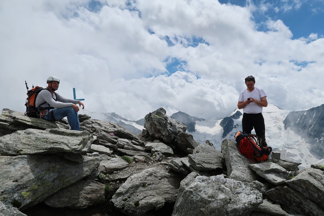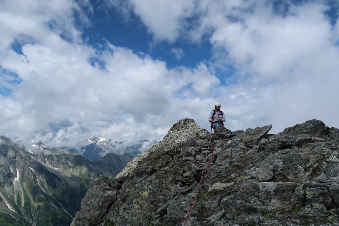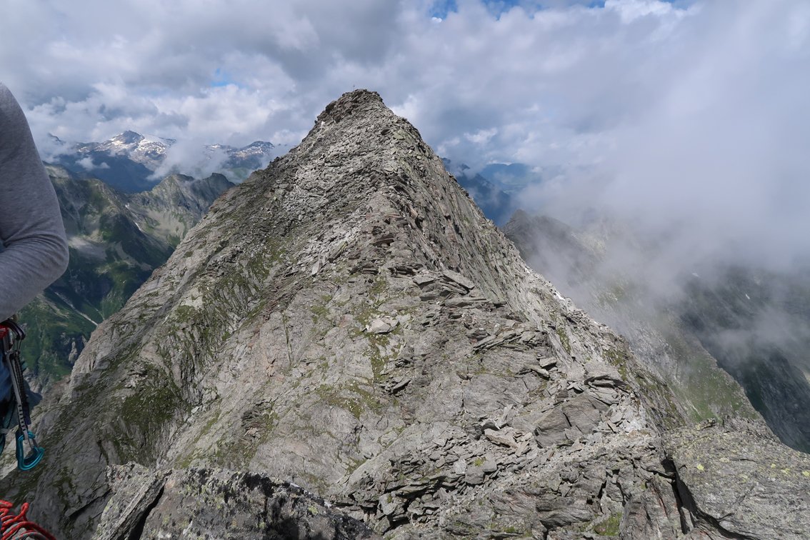Vom Ende der Kletterei in eine Scharte abseilen (20 m). Von dort entlang des Grates (oder tlw. leichter westlich davon) zum Hauptgipfel (2-3 UIAA). Dort auf dem steilen aber markierten Normalweg hinunter zur Greizer Hütte und von dieser zurück ins Tal.