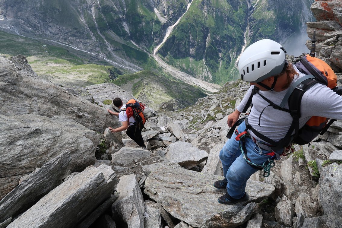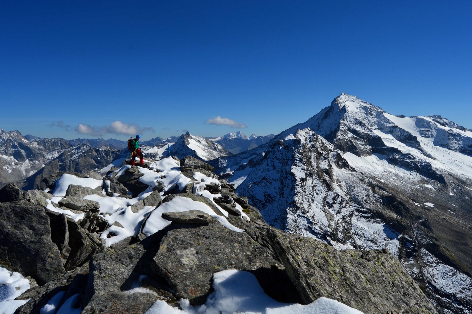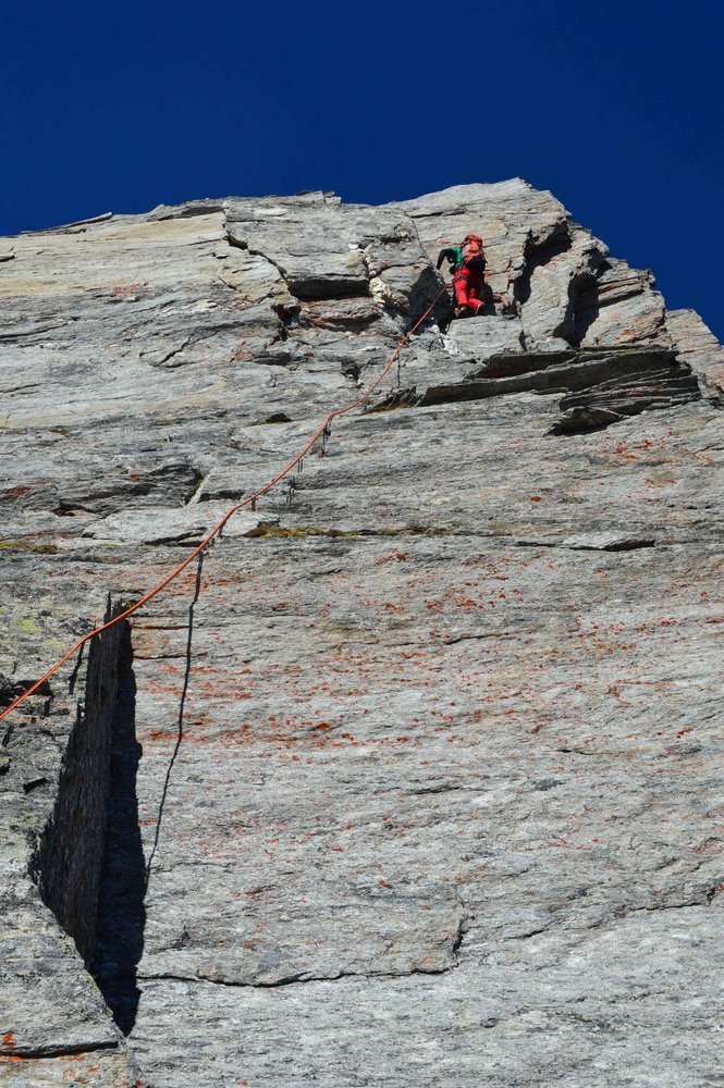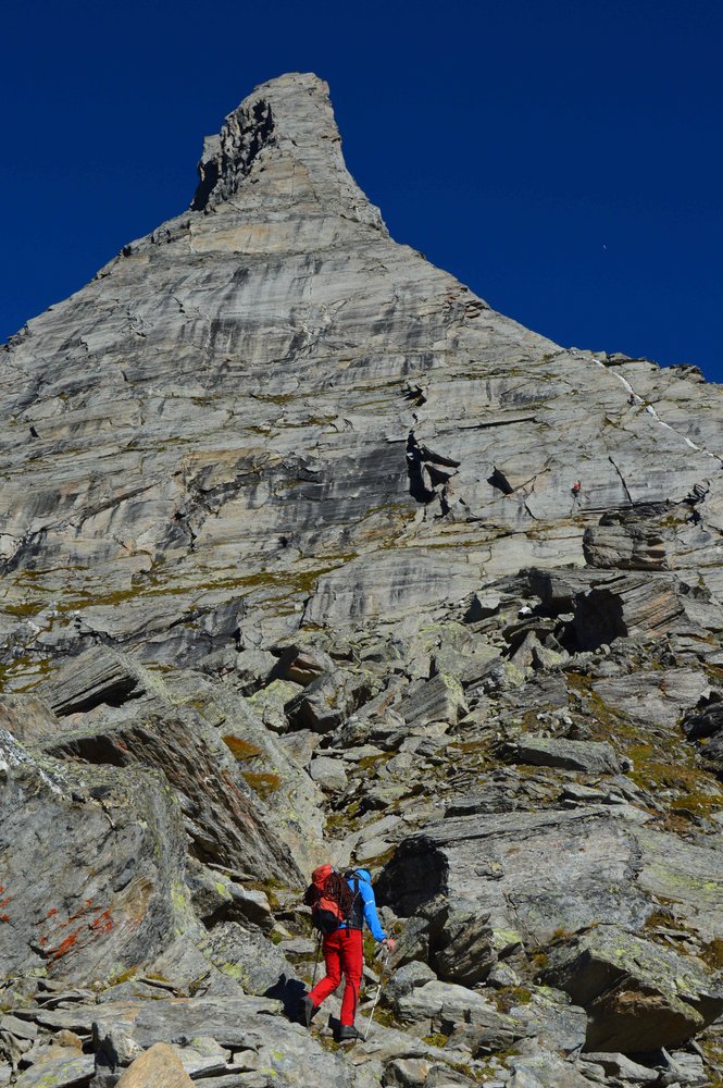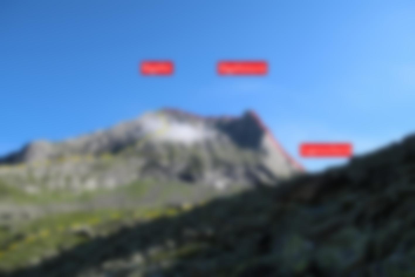 Vom Ende der Kletterei in eine Scharte abseilen (20 m). Von dort entlang des Grates (oder tlw. leichter westlich davon) zum Hauptgipfel (2-3 UIAA). Dort auf dem steilen aber markierten Normalweg hinunter zur Greizer Hütte und von dieser zurück ins Tal.