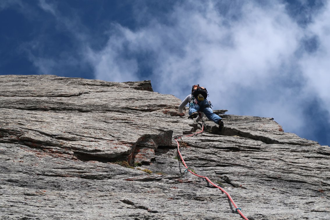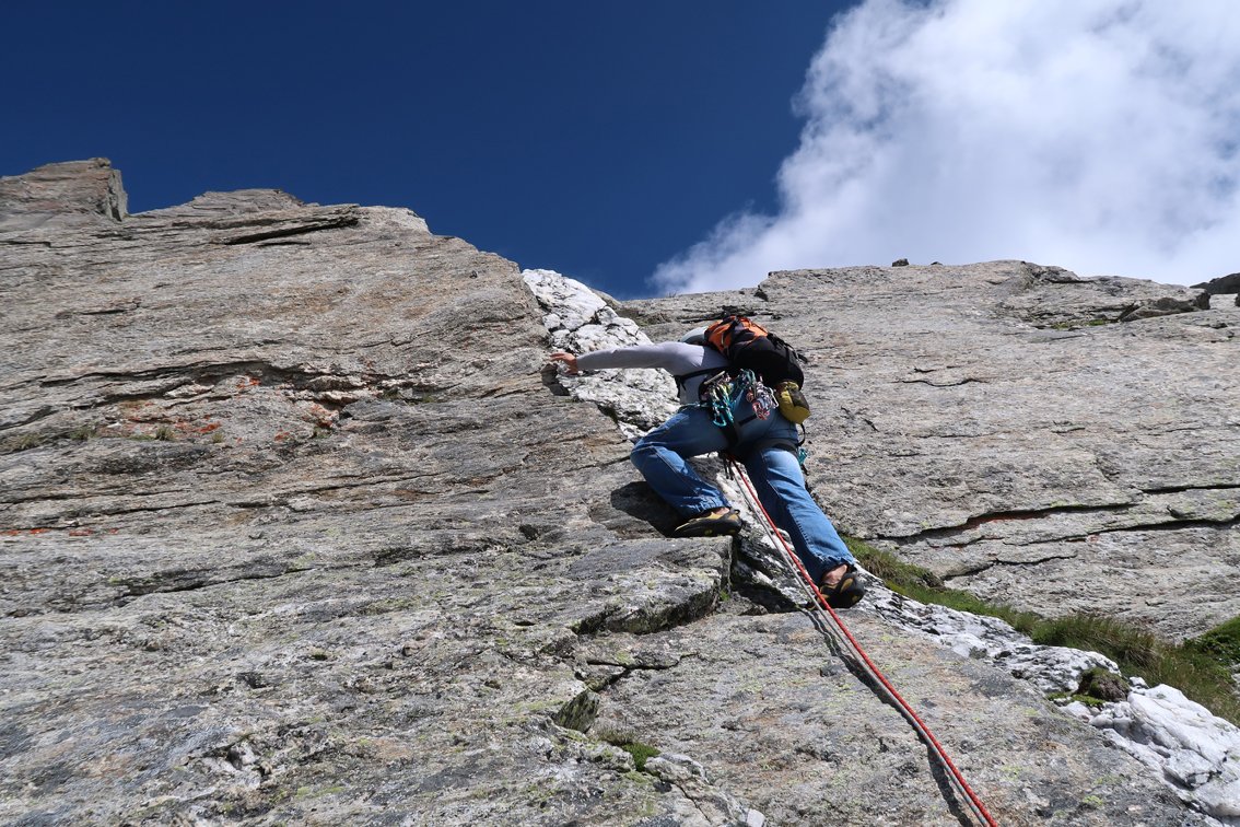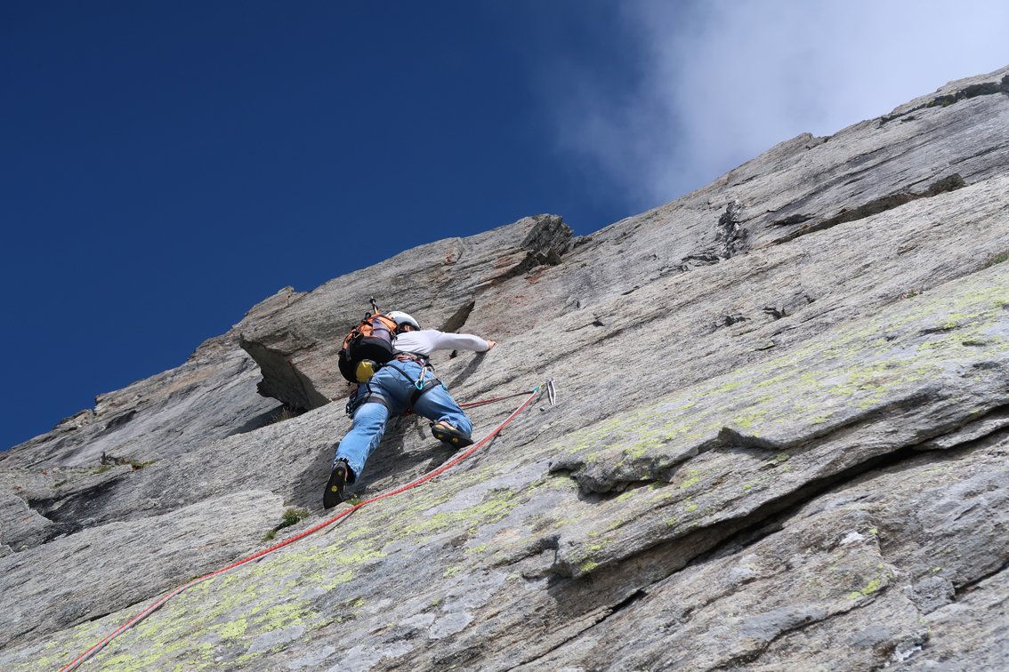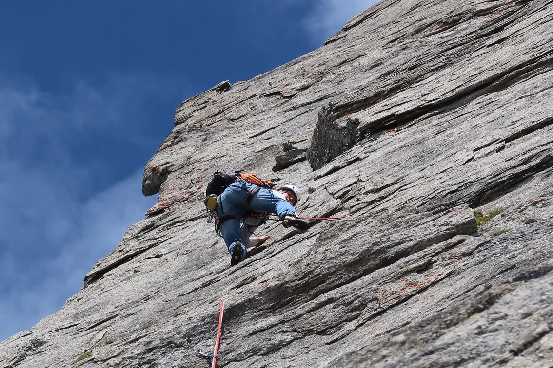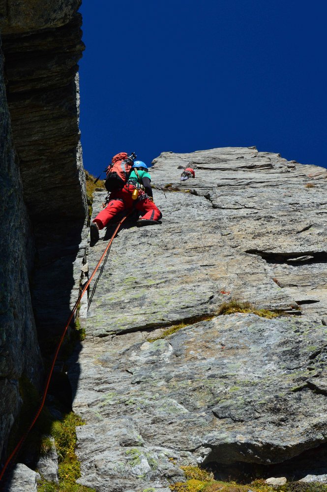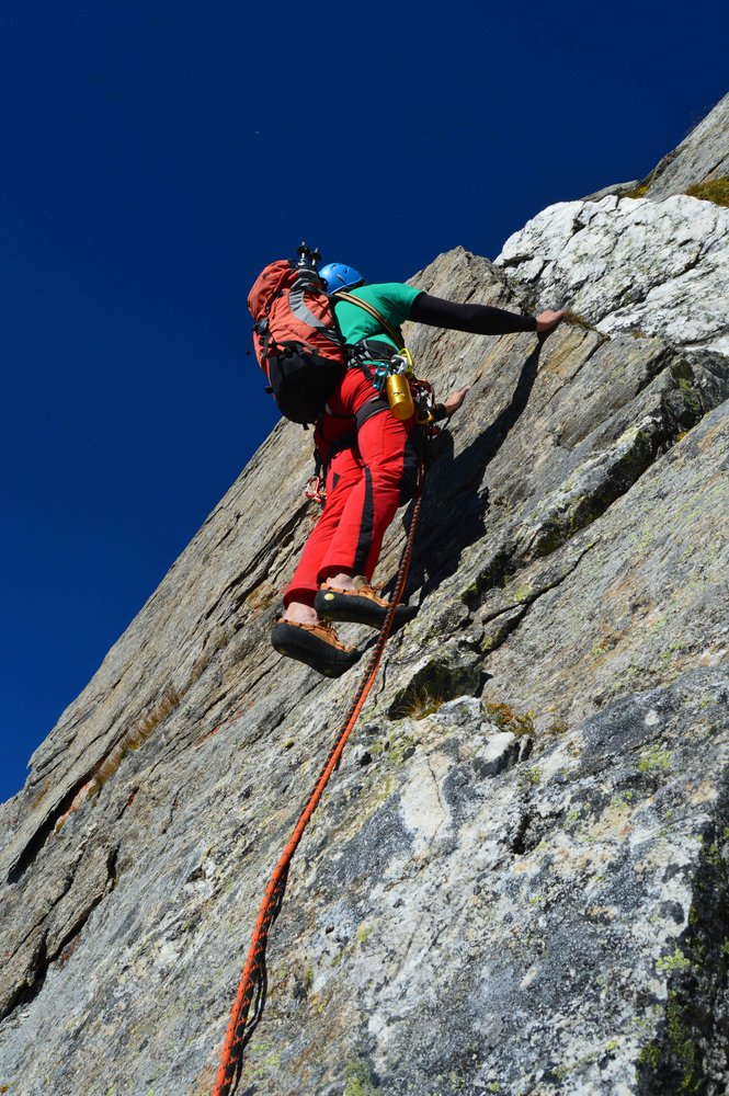Für eine alpine Tour ganz gut mit Bohrhaken gesichert. Im leichten Gelände aber lange Hakenabstände, auf dem Verbindungsgrat (2-3) stecken keine Haken.