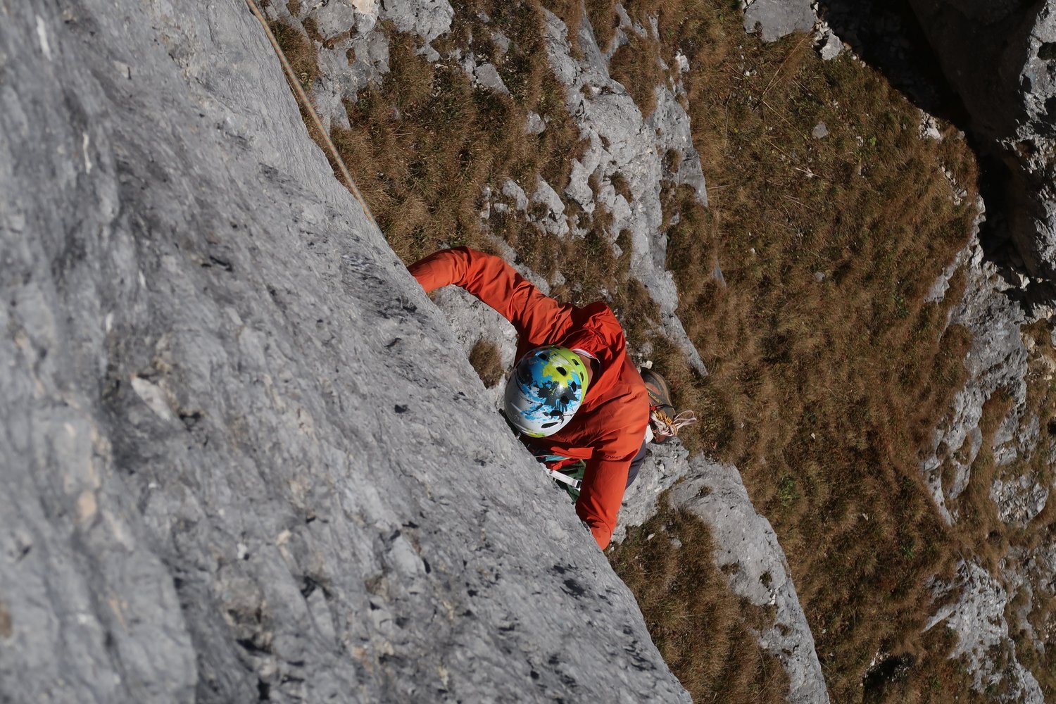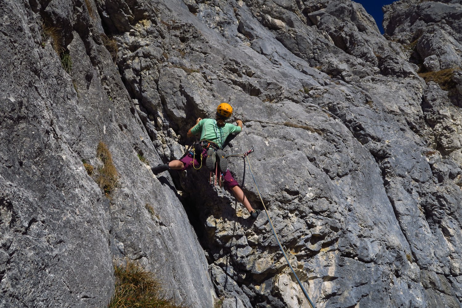 Gute Absicherung mit BH, in den leichteren Passagen teilweise weitere Abstände. Die Schrofenpassagen sind nicht abzusichern.