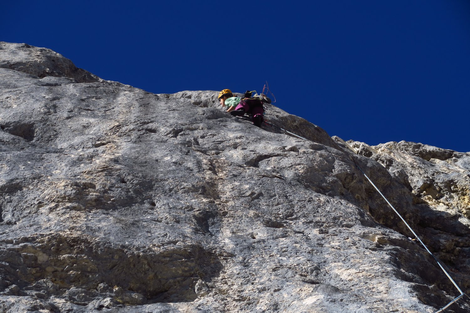 In dieser Tour ist nicht jeder Griff fest. Durch die Begehungen wird die Route von Jahr zu Jahr besser. Vorsicht, bei Nässe, auf der steilen Wiese, bei dem kurzen Abstieg zum Fixseil (Abseilpiste)!