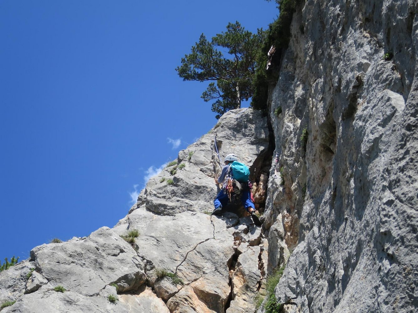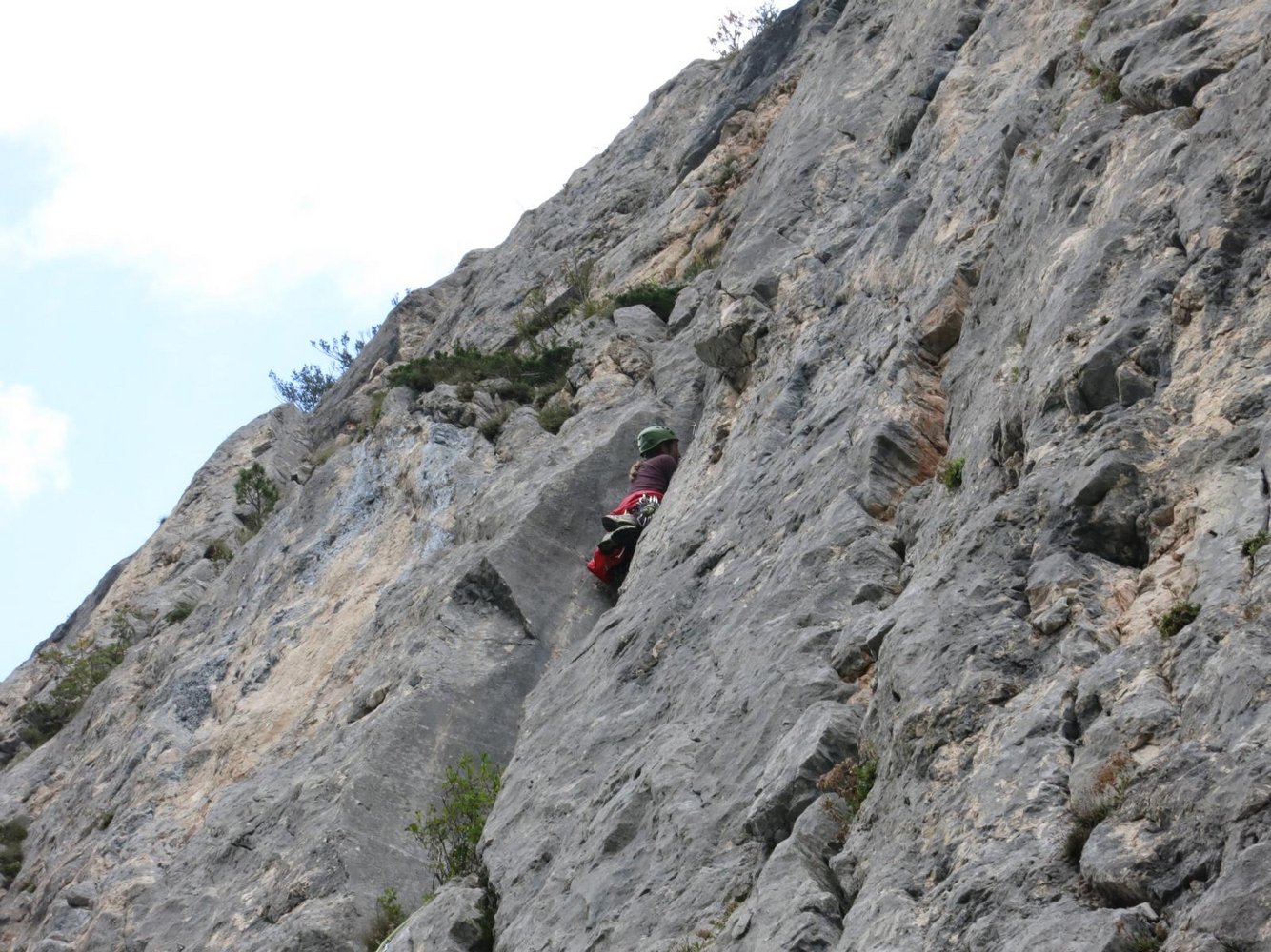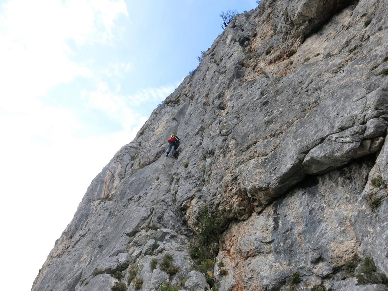 Die Route ist sehr gut mit Bohrhaken und Stahlbügeln an den Ständen abgesichert. Keine Klemmkeile oder Friends erforderlich.