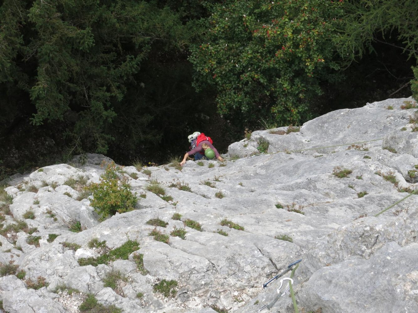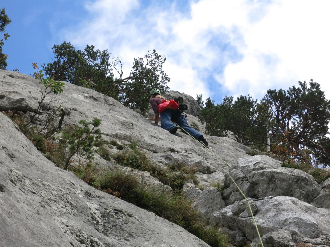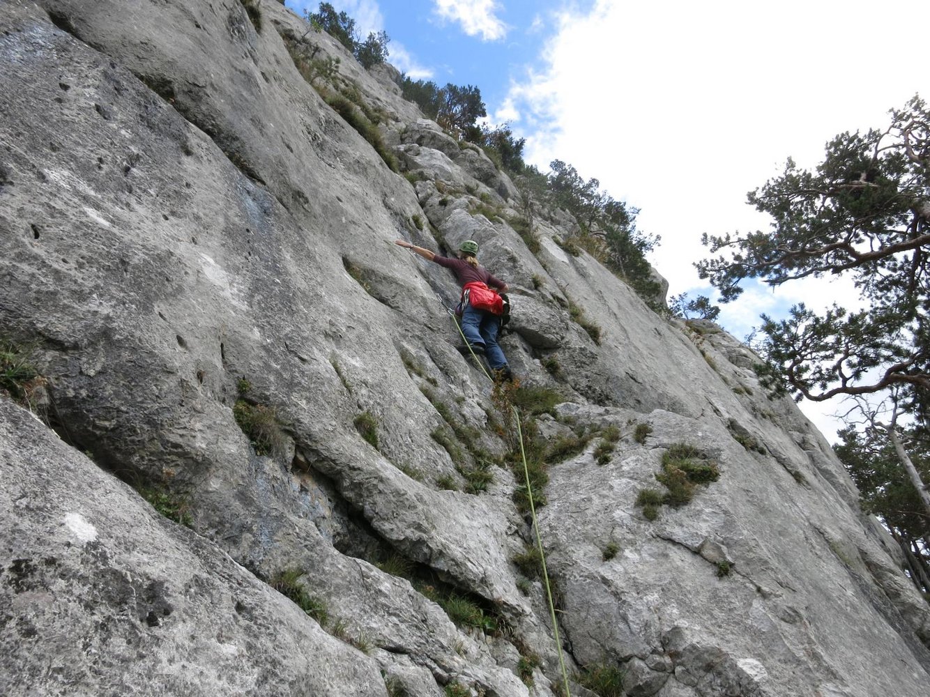 Die Route ist sehr gut mit Bohrhaken und Stahlbügeln an den Ständen abgesichert. Keine Klemmkeile oder Friends erforderlich.