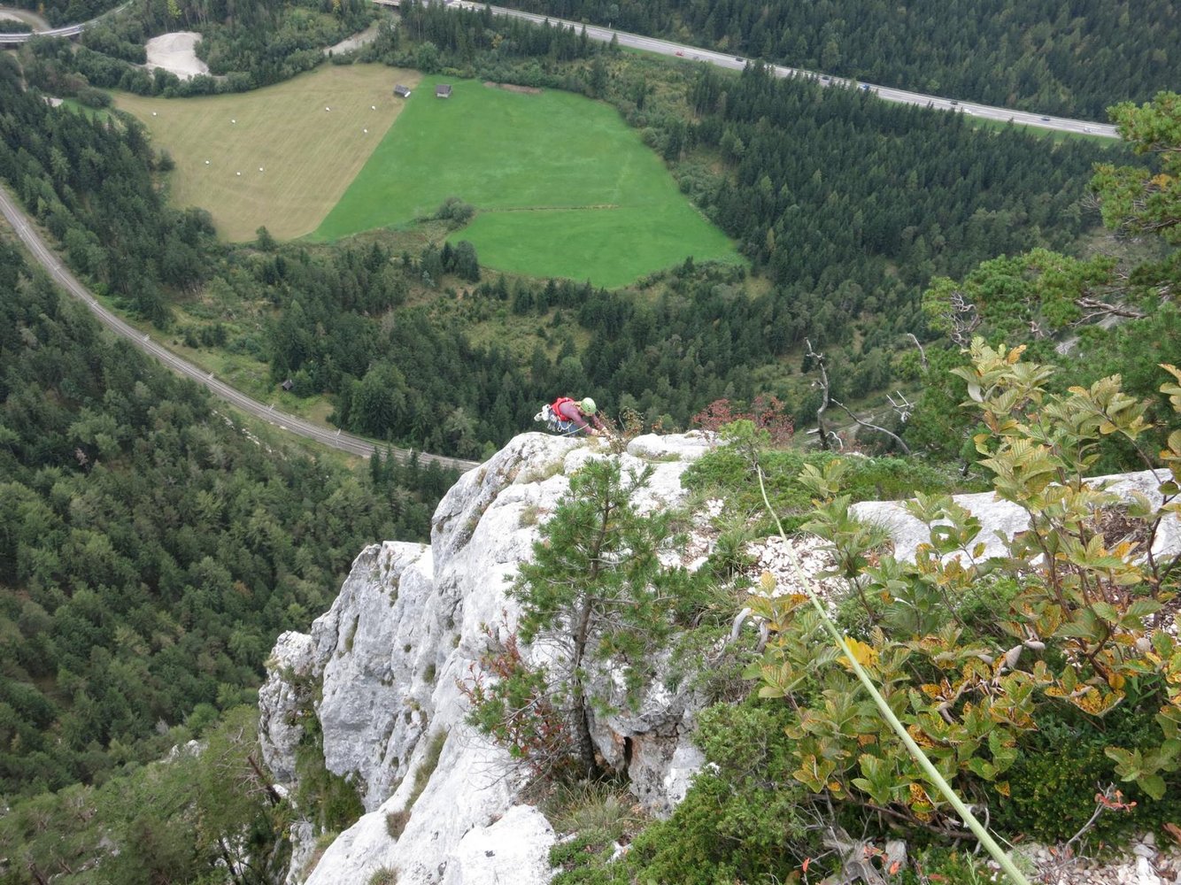 Am Ausstieg kurz durch den Wald und über Aufschwünge aufwärts bis man auf einen markierten Wanderweg trifft. Auf diesem rechts hinunter nach Pürgg abstiegen.