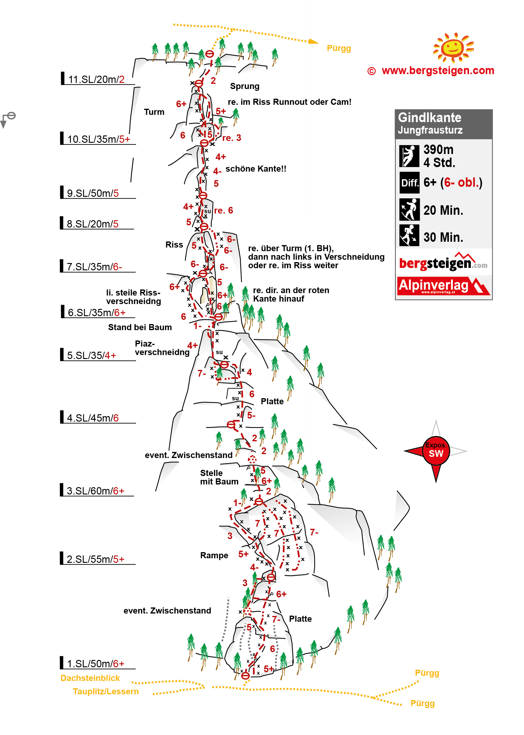 Sehr schöne Kantenkletterei am Jungfrausturz an durchwegs festem Fels. Die Tour ist sehr gut mit Bohrhaken und Normalhaken abgesichert. Der Einstieg ist bequem von Pürgg aus zu erreichen und die Kletterei wird nach oben hin immer schöner. Die Tour verläuft oben auch direkt an einer exponierten Kante.