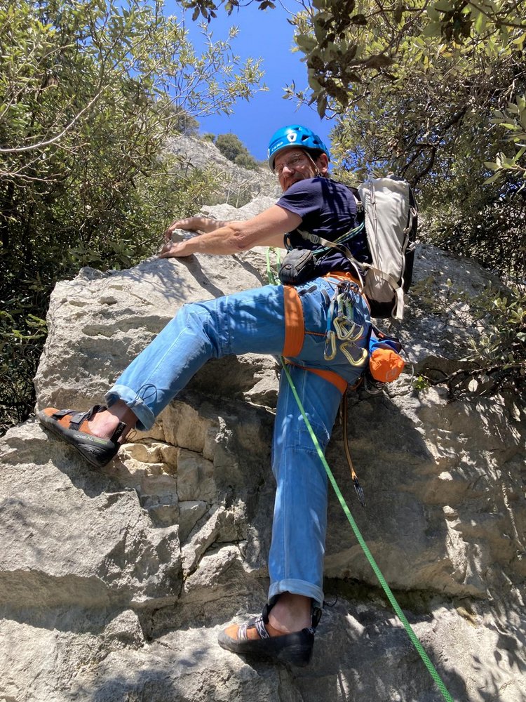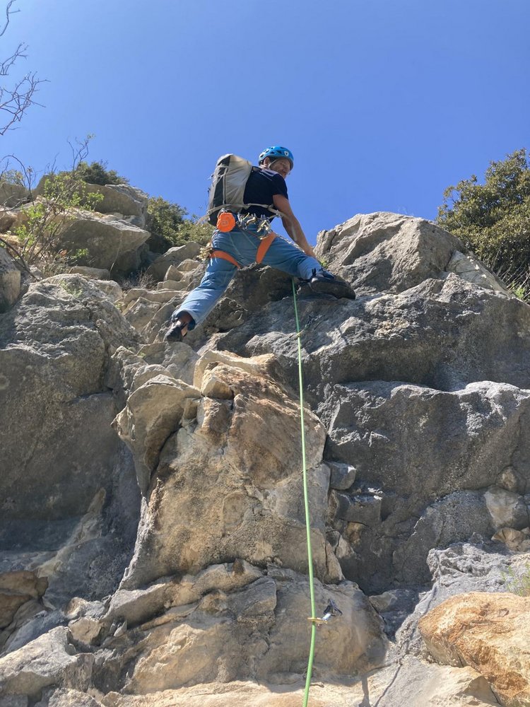 60 m Einfachseil, 12 Expressschlingen, Bandschlingen und Helm.