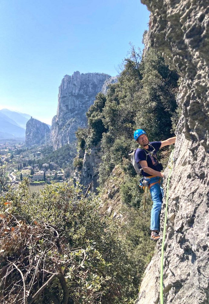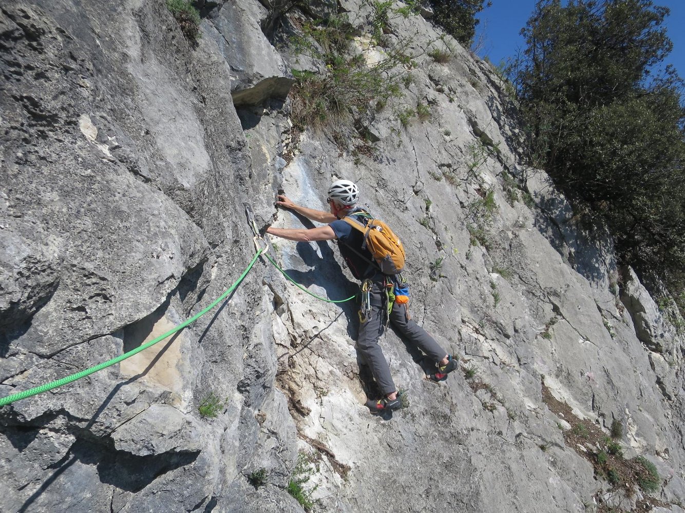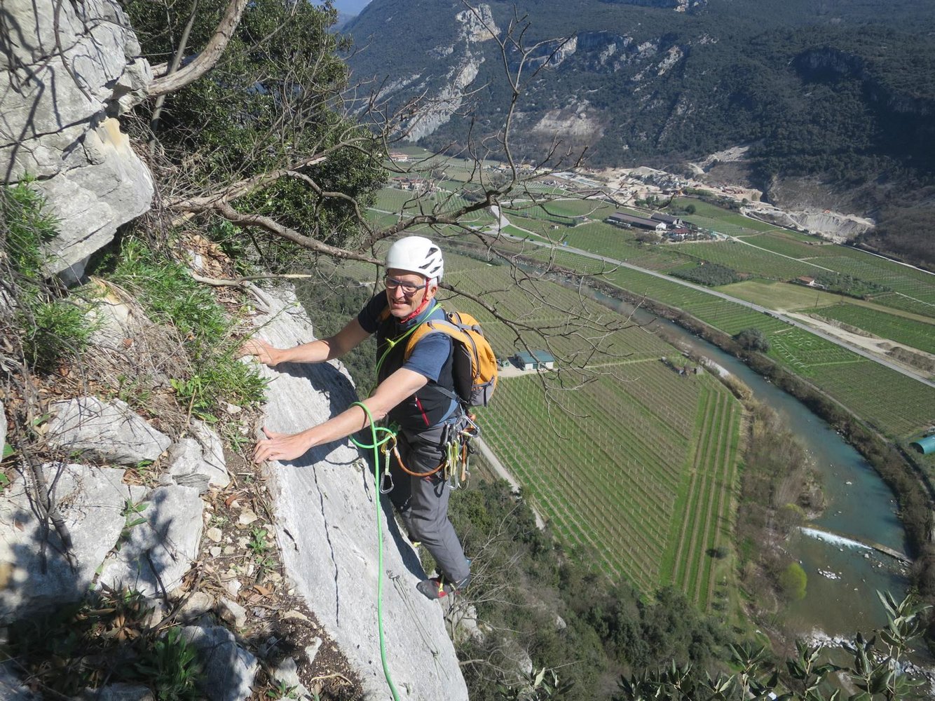 Vom Ende der Route kurz links aufwärts (nicht das rote Felsband nach links), oben auf dem Kamm entweder links zum "alpinen" Schnellabstieg (ausgesetzt, steile Passagen mit Fixseilen versehen) und auf diesem hinunter zur Straße oder auf dem Wanderweg nach links zum nördlichen Ende der San Paolo Felswand absteigen und auf der Straße wieder zurück in Richtung Arco.