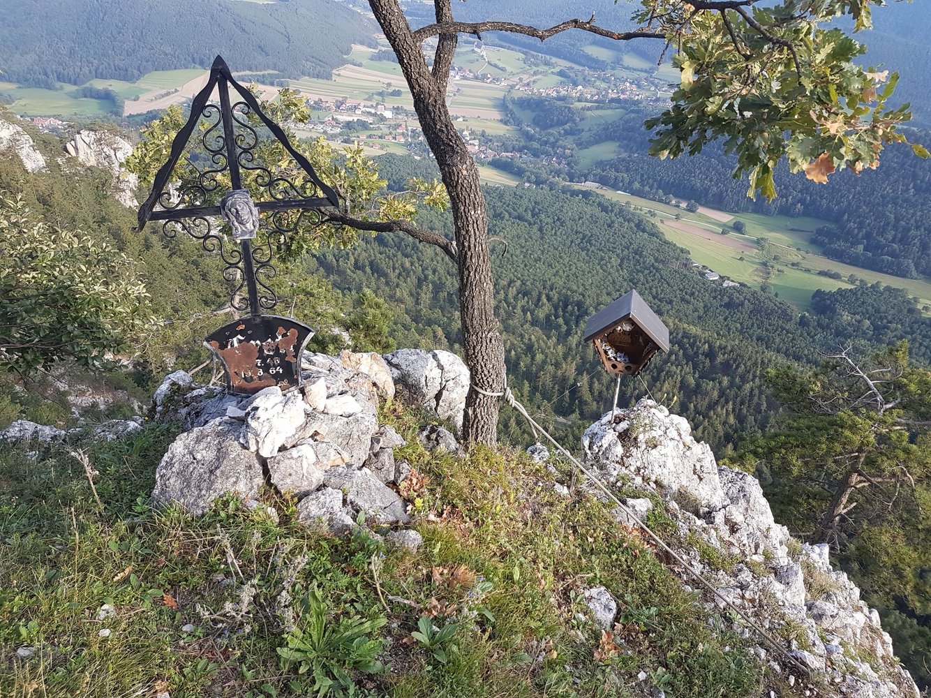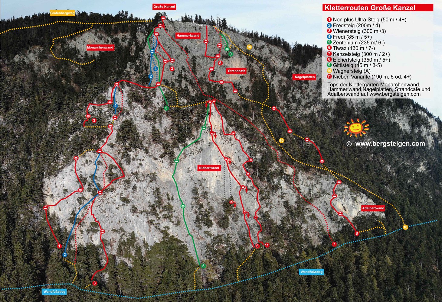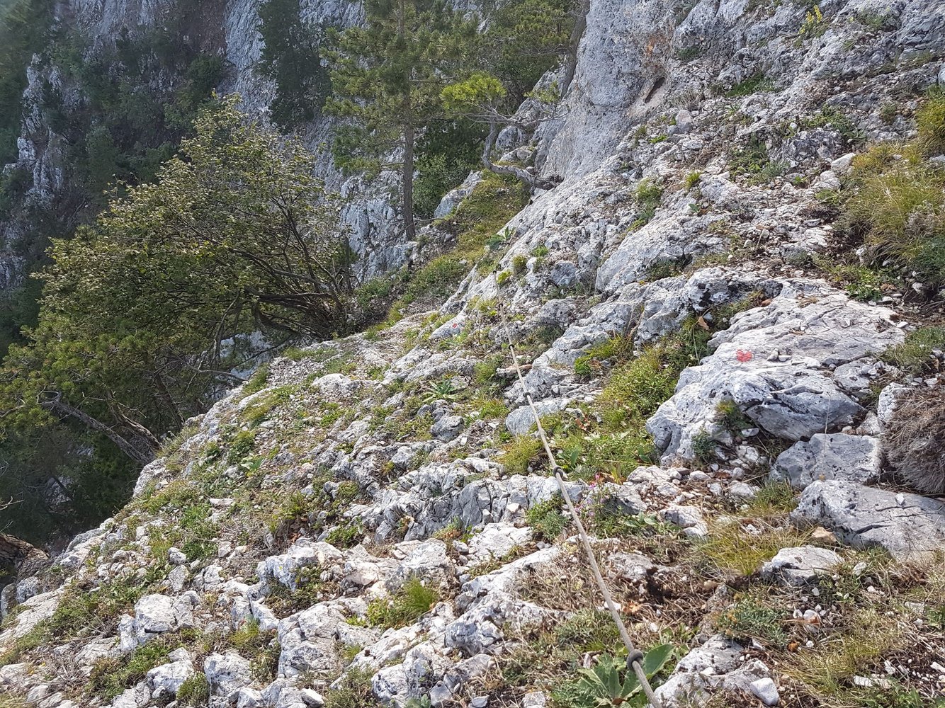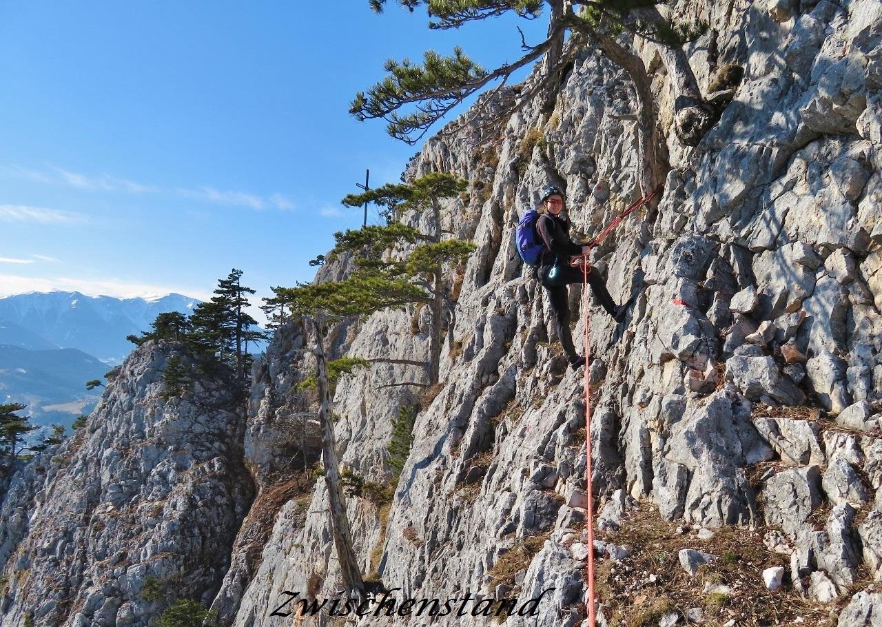 1. SL: Über eine steile Platte in eine kurze Verschneidung mit Bäumchen. Dann netter Felsgrat, bis dieser flach ausläuft (in der Nähe des Wagnersteiges). Dort horizontal nach links (Pfeil) zu Stand bei Baum. 40 m, 3 und 2. 2. SL: Gemeinsam mit dem Eichertsteig: Schräg links über eine Plattenrampe empor zum Wiesenrand (Ausstieg des Wagnersteiges, BH-Stand etwas links davon). 15 m, 2.