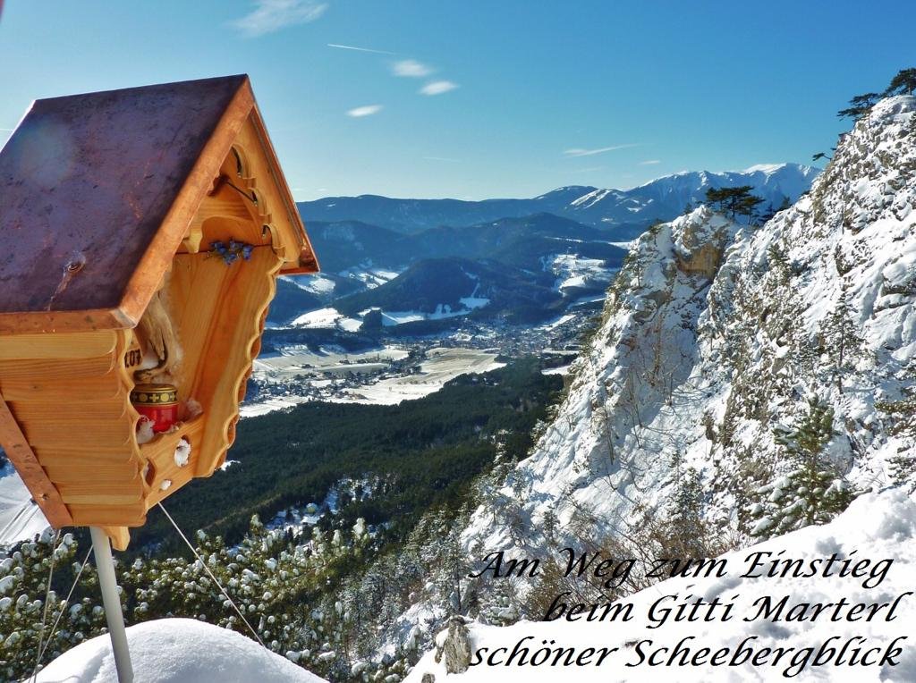 Von Oberhöflein oder Zweiersdorf auf dem gelb bezeichneten Wagnersteig, besser jedoch kletternd über den Eichertsteig (3+ oder 4), zur Eicherthütte. Von der Eicherthütte absteigend (5 min). Am Wagnersteig 40 m bergab, dann rechts abzweigen und entlang einer roten Punktmarkierung über Schrofen hinunter zu einem Gedenkkreuz. Von dort schräg rechts entlang eines Fixseiles bergab zu einem Grasabsatz. Dort ist der Einstieg angeschrieben.