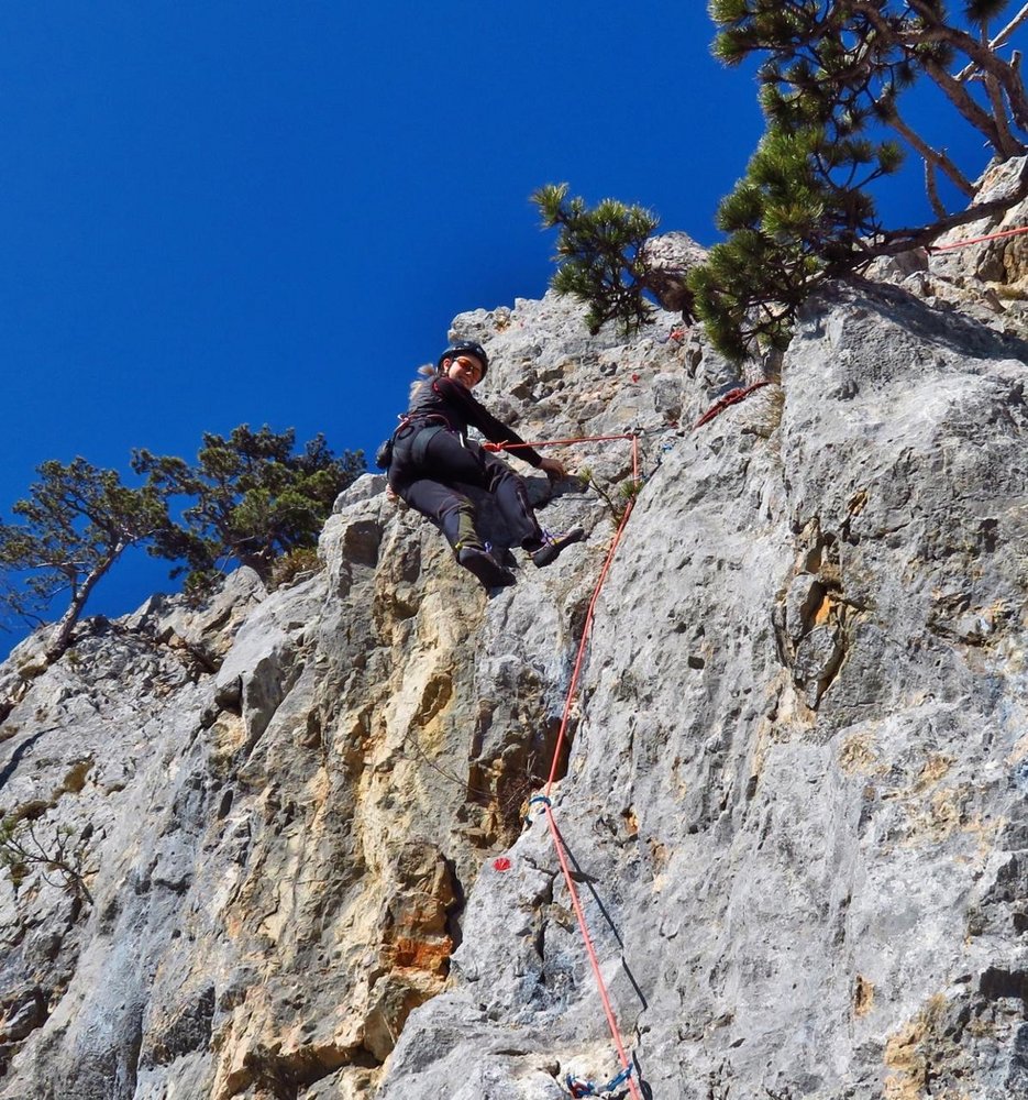 Stände mit Bohrhaken, dazwischen Normalhaken, Baum- und Sanduhrschlingen.