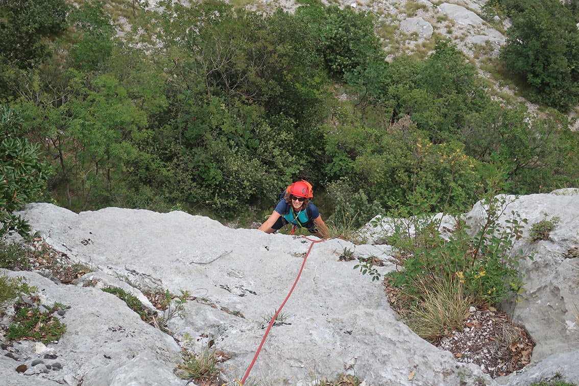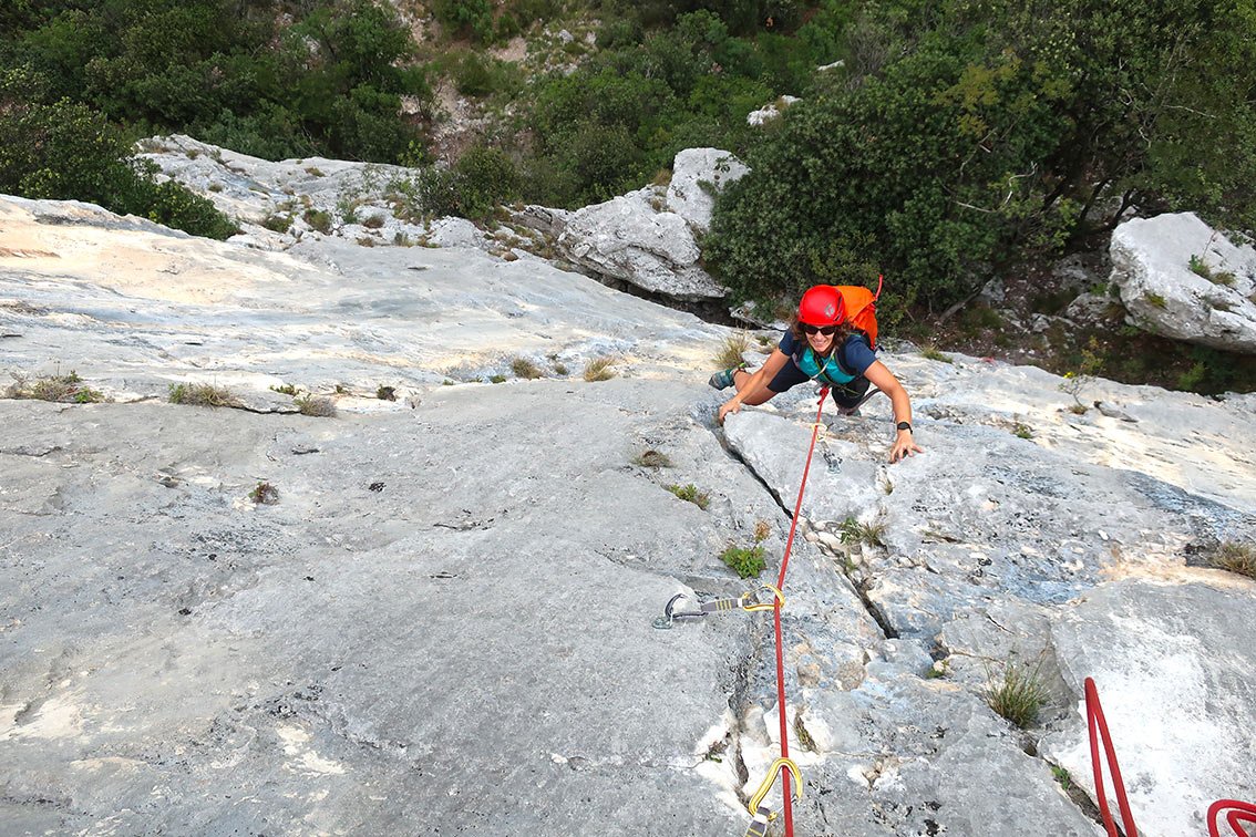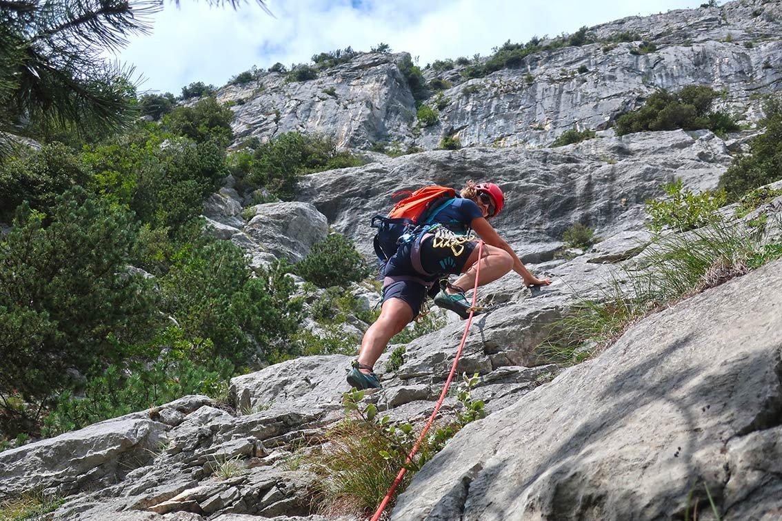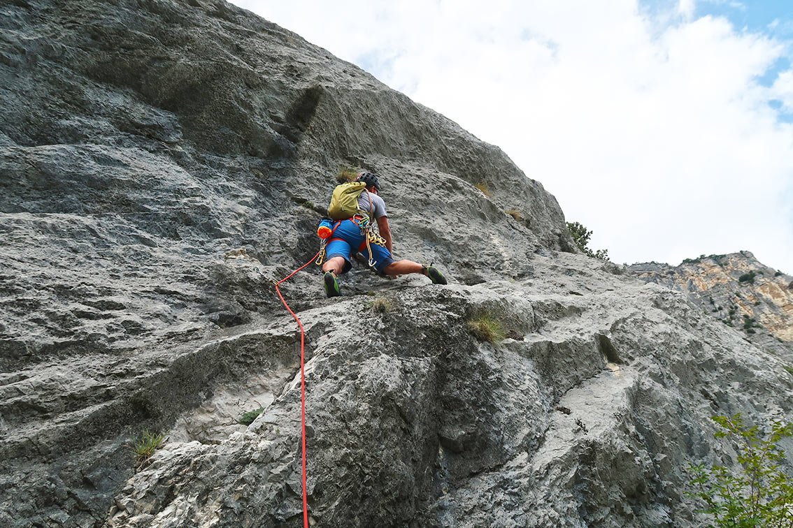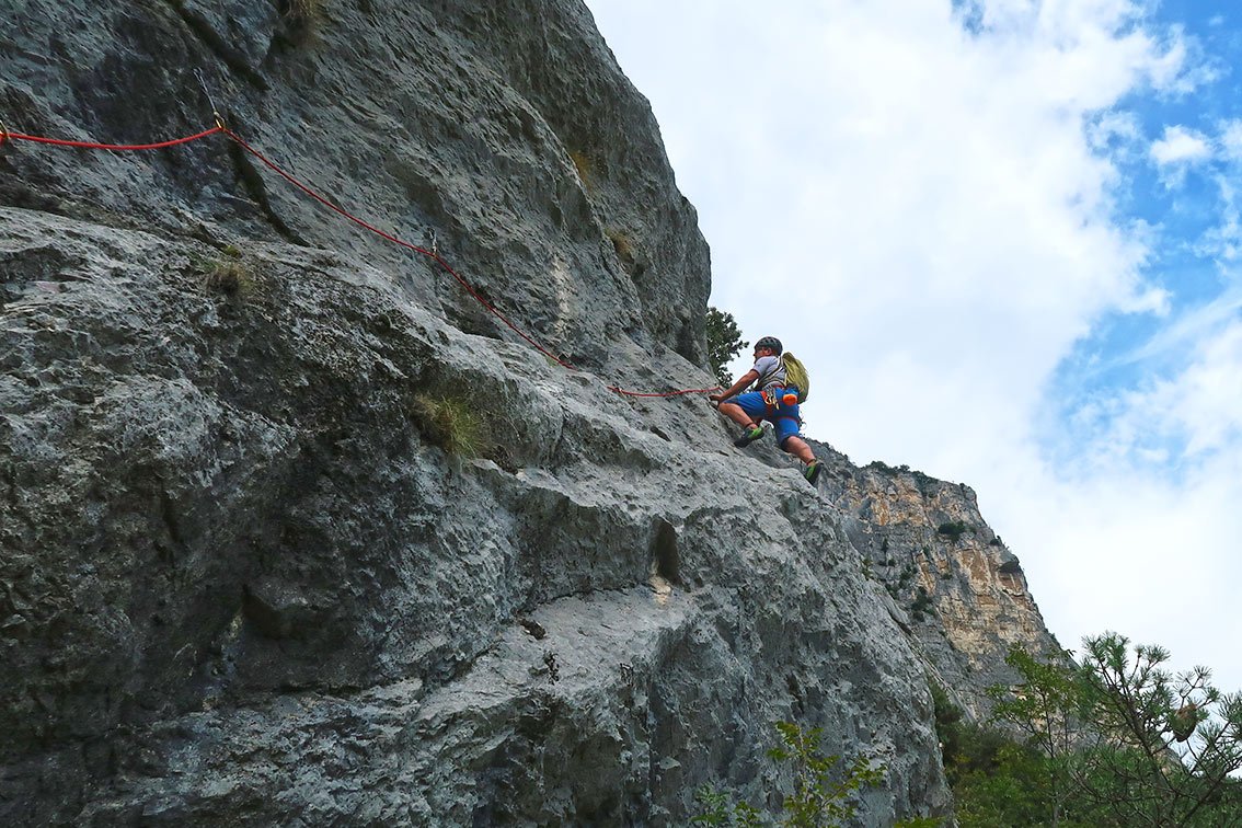 Die Tour ist sehr gut abgesichert, die Schlüsselstellen kann man technisch klettern. Im unteren Teil leider viel Schrofenkletterei.
