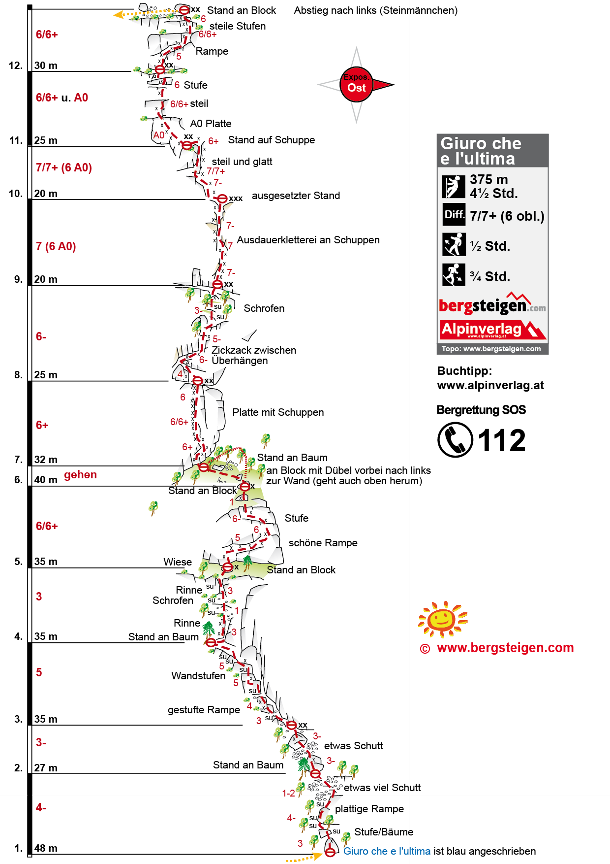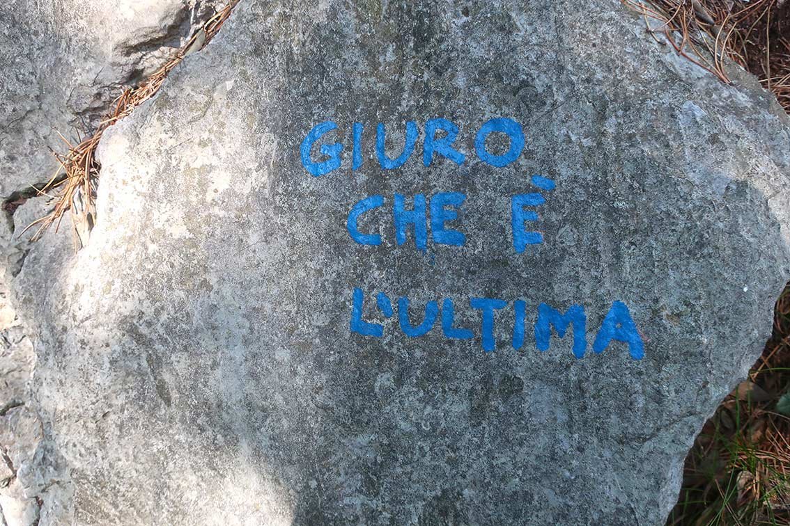 Die Giuro che e l'ultima ist eine lange Plaisirroute bei Dro. Die Tour beginnt leider etwas schrofig und wird ab der Mitte aber besser. Im oberen Teil warten zwei steile Ausdauerseillängen, wegen der vielen Bohrhaken kann man Angstgefühle aber zu Hause lassen. Nicht auf dem Niveau der benachbarten "Dinosauri" oder der "Luca Franz Franceschini", wenn man die aber schon kennt bzw. man wegen viel Betrieb ein Ausweichziel braucht, kann man die Giuro che e l'ultima ruhig mal versuchen.