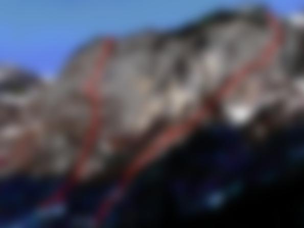 Einstiegsvariante 1: 1. SL V, 2. SL V, Einstiegsvariante 2: 1. SL VI-, 2. SL V/A0, 3. SL IV, 4. SL V-, 5. IV-, 6. SL IV, 7. V+, 8. III, 9. SL VI+ oder VI/A0, 10. SL 1 Stelle VI+/A0 oder frei VIII-, 11. V+, 12. V, 13. III