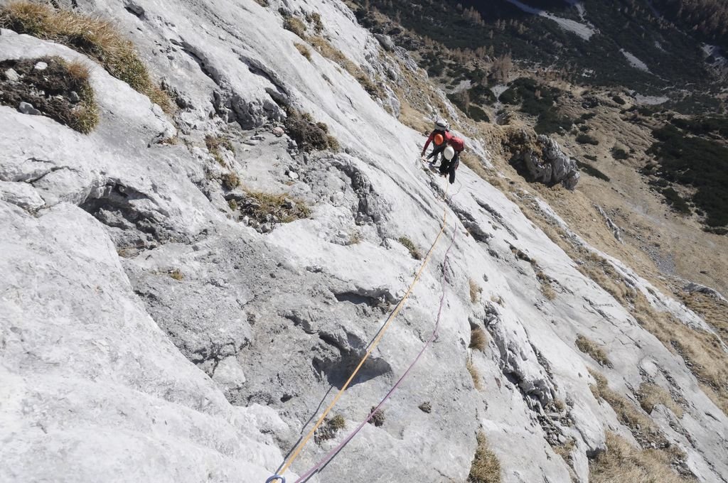 1.) Im unteren Teil nach der 5. oder 7. SL nach rechts ins grasige Schrofengelände und Abstieg über Steilwiesen und eine Schrofenschlucht (1-2) zum Wandfuß gut 100 m rechts (südlich) des Einstieges. Keine Sicherungsmöglichkeiten, bei Nässe gefährlich!
