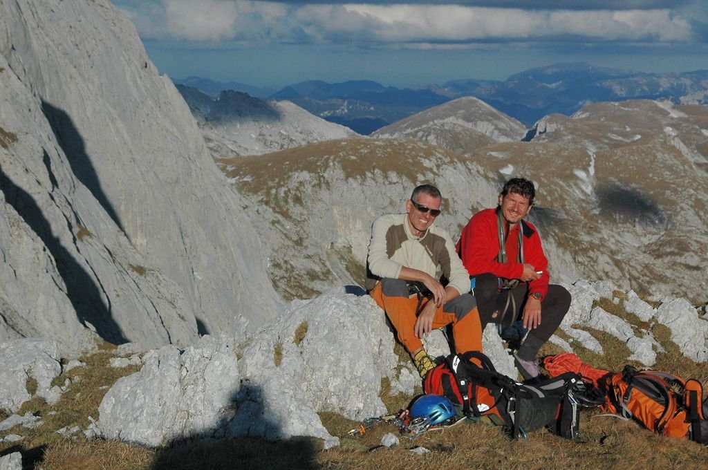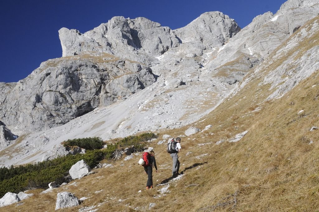 Vom Ausstieg in 1 min. nach Osten zum Hauptgipfel mit Steinmann, von dort weiter in Richtung Osten bis zu einer kleinen Einsattelung (hier Gipfelbuch). Nun nordseitig absteigen (Vorsicht bei Nässe oder Schnee: Unter den Steigspuren, die auf der Nordseite zuerst nach links führen, befindet sich eine Doline mit überhängendem Abbruch!), und nach Erreichen der Wiese rechtshaltend zum Hochschwab-„Normalweg“ übers G´hackte. Vom Ausstieg bis hierher nur etwa 5 min.!