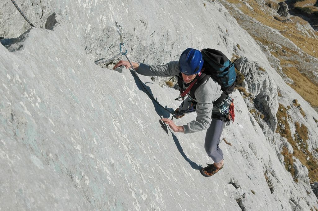 Schöne, lange und wegen mehrerer Fluchtmöglichkeiten nicht all zu ernste hochalpine Kletterei, die die SW-Wand des G´hacktsteins von rechts unten nach links oben (direkt zum Gipfel) diagonal durchzieht. Bis zur Mitte der Wand Durchsetzung mit Rasenstufen, zwischen denen sich die Route die schönsten Platten sucht. Das Gras stört nicht besonders, außer bei Nässe.