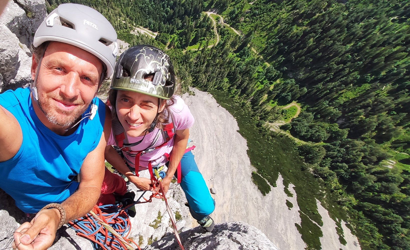 In der 6. Seillänge nicht geradeaus die Verschneidung weiter, sondern beim 4. Bohrhaken links um den Pfeiler und dann schräg links weiter zum Stand.