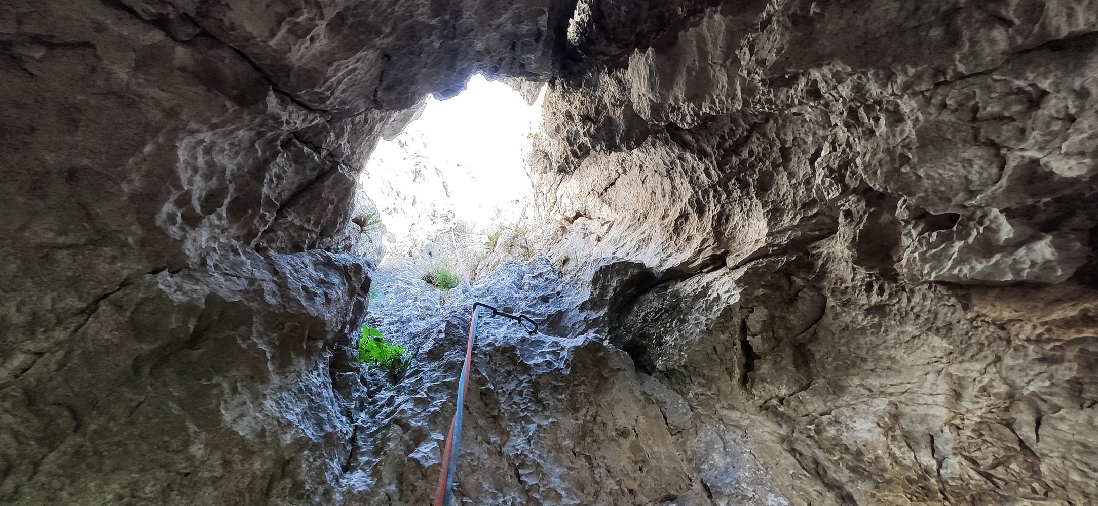9 x Abseilen über die Kletterroute, alle Stände sind als Abseilstände eingerichtet und mit Abseilringen ausgestattet, Redundanz mit Klebehaken. VORSICHT! Stände sind nicht immer leicht zu finden und Steinschlag ist naturgemäß auch ein Thema.