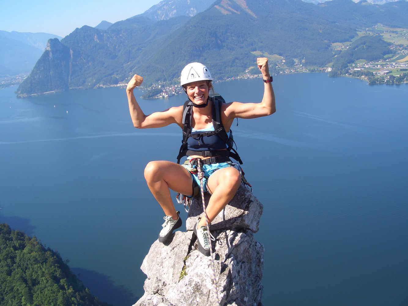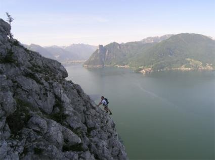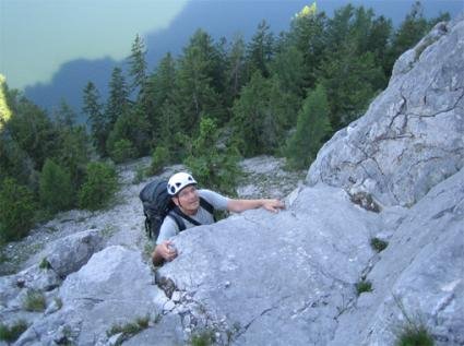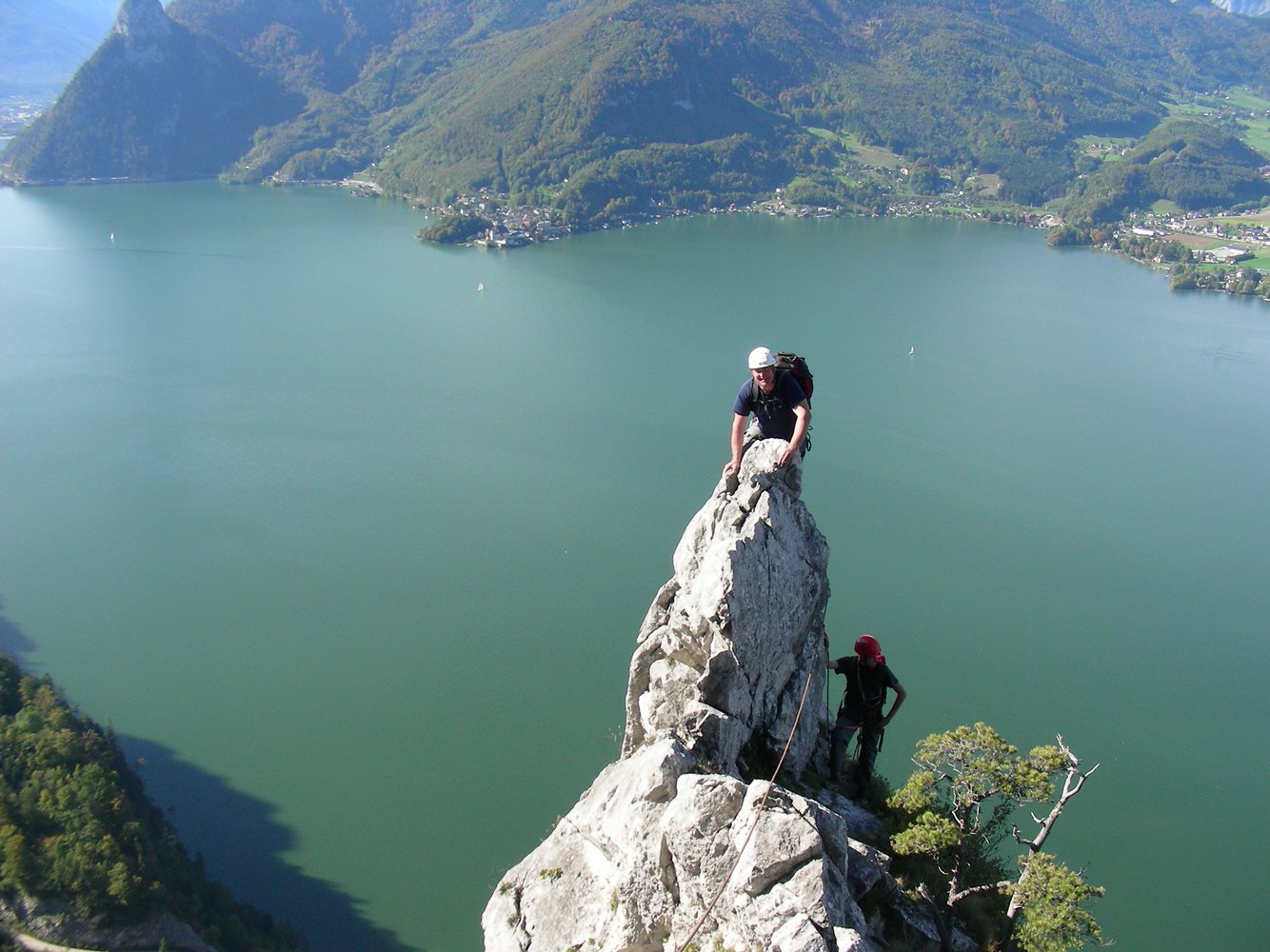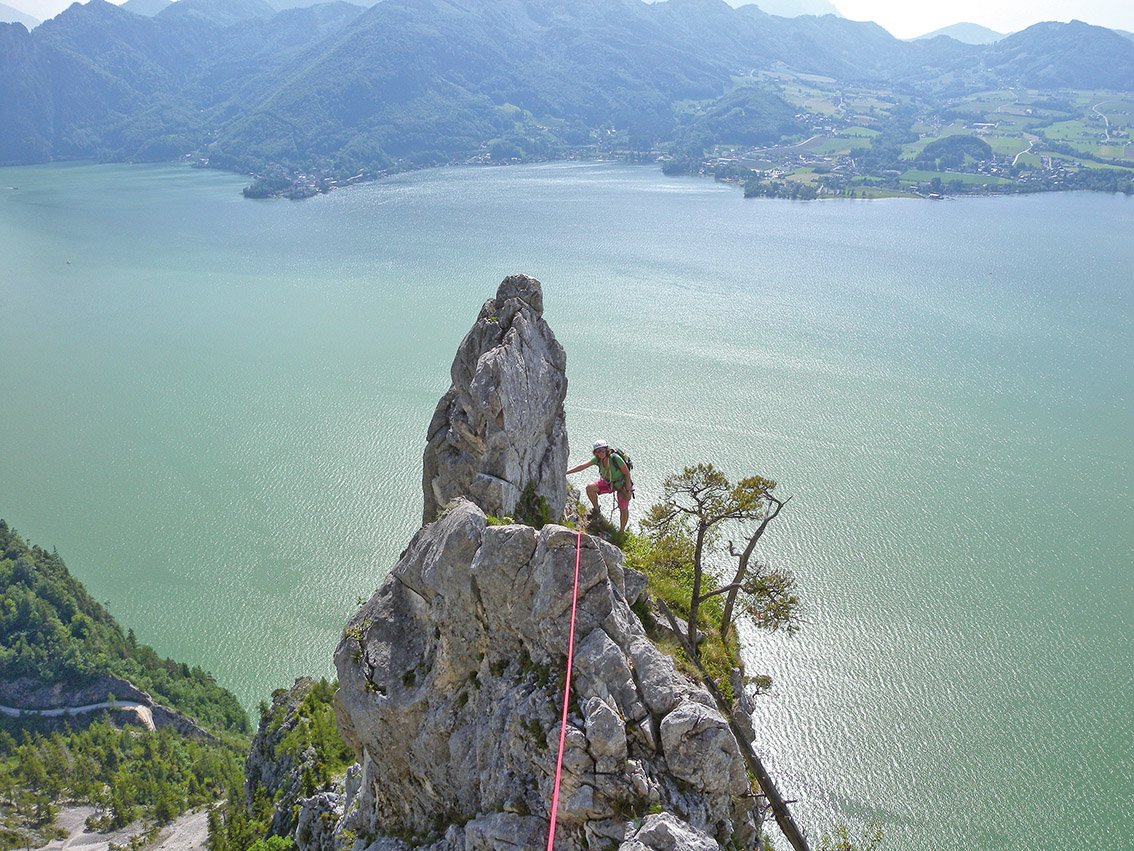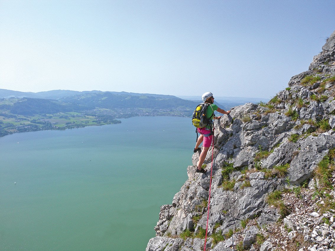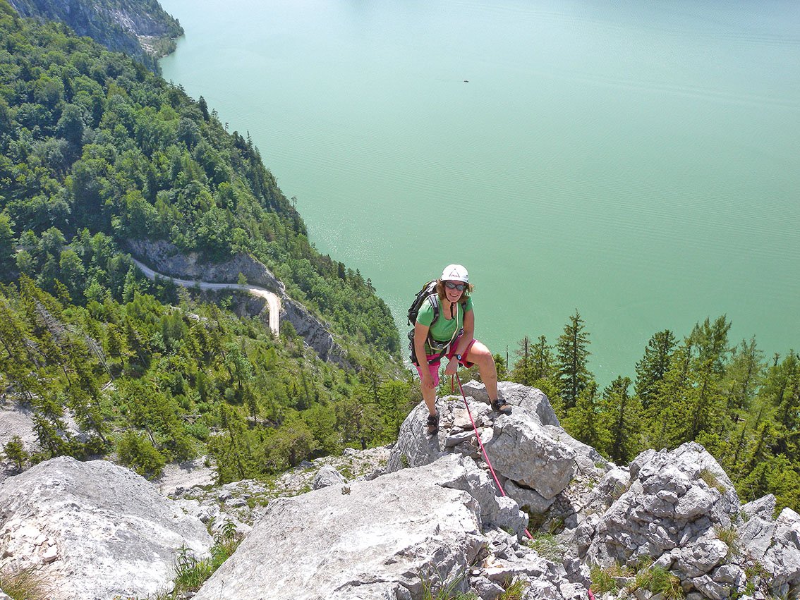 Wasser und steile Felswände, diese Kombination ist immer etwas Besonderes und so verwundert es kaum, dass der Traunstein SW-Grat zu den großen Klassikern in Oberösterreich gehört. Die Tour ist genial, man klettert immer sehr luftig und ausgesetzt entlang des Grates aufwärts. Die Kletterei ist aber nie besonders schwer, alle Stellen lassen sich einfach bewältigen. In Kombination mit dem Gmundnerweg kommt eine lange, tagesfüllende Klettertour zustande, bei der man immer tolle Ausblicke auf den Traunsee hat. Im Sommer lockt vor allem die Badeund Klettermöglichkeit. Direkt beim Parkplatz gibt es einen Badeplatz, an dem man nach der Tour seine müden Knochen genüsslich in der Sonne rekeln kann.