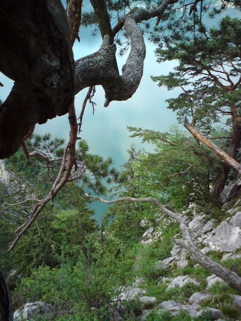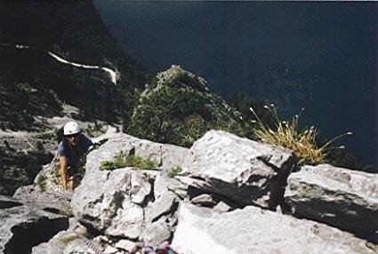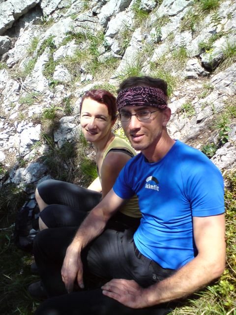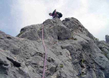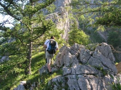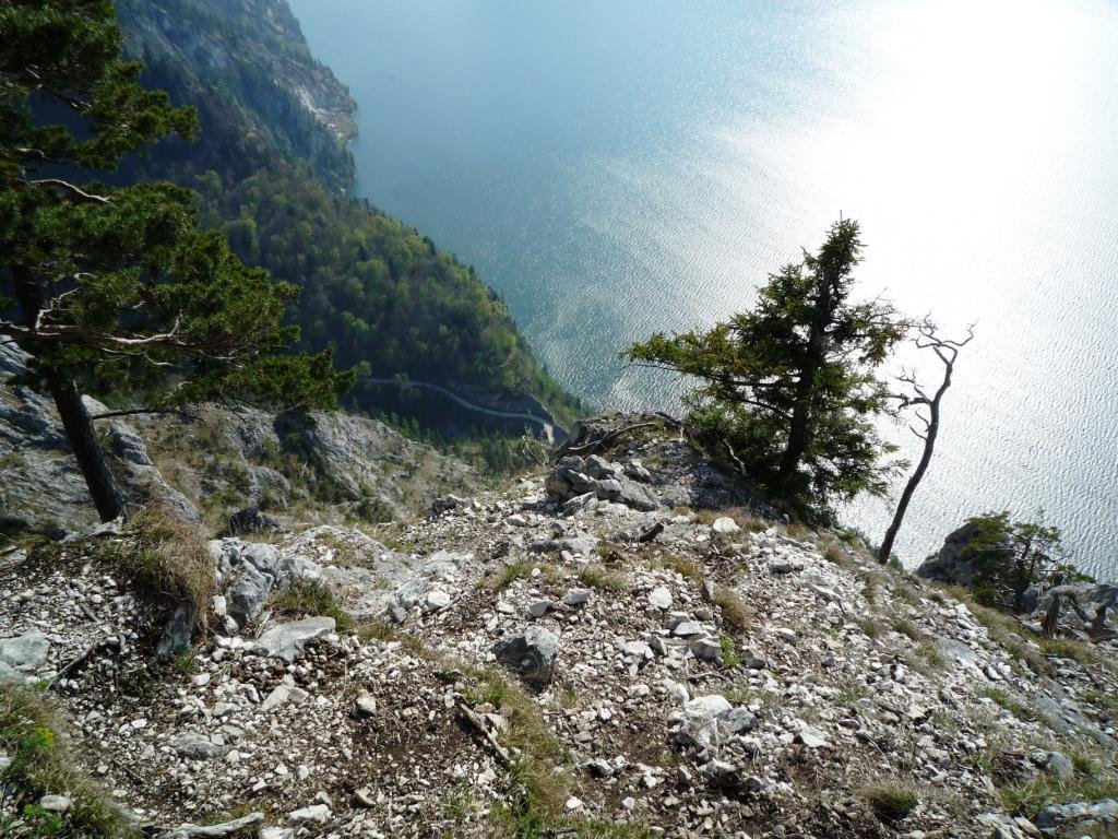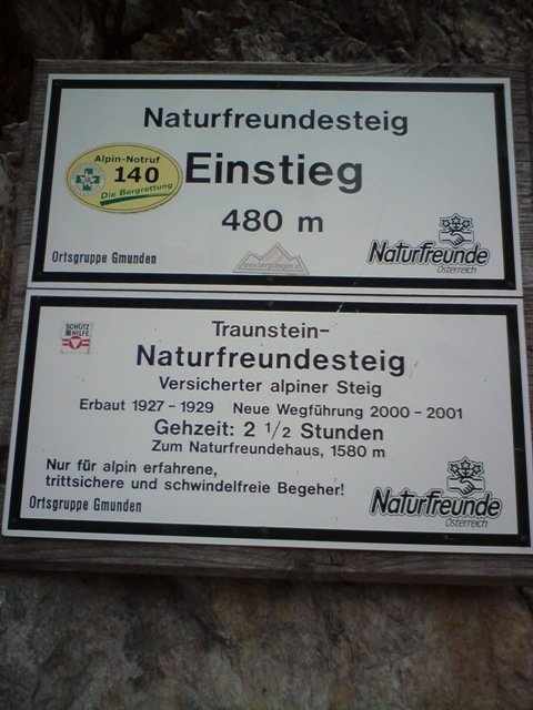 Vom Ende der Kletterei steigt man im Bereich des Grates weiter auf, ganz oben dann links davon (es geht aber auch direkt). Man kommt auf ca. 1000 m zum Nturfreundesteig (markierter Aufstieg zur Traunsteinhütte). Dort rechts dem Naturfreundesteig