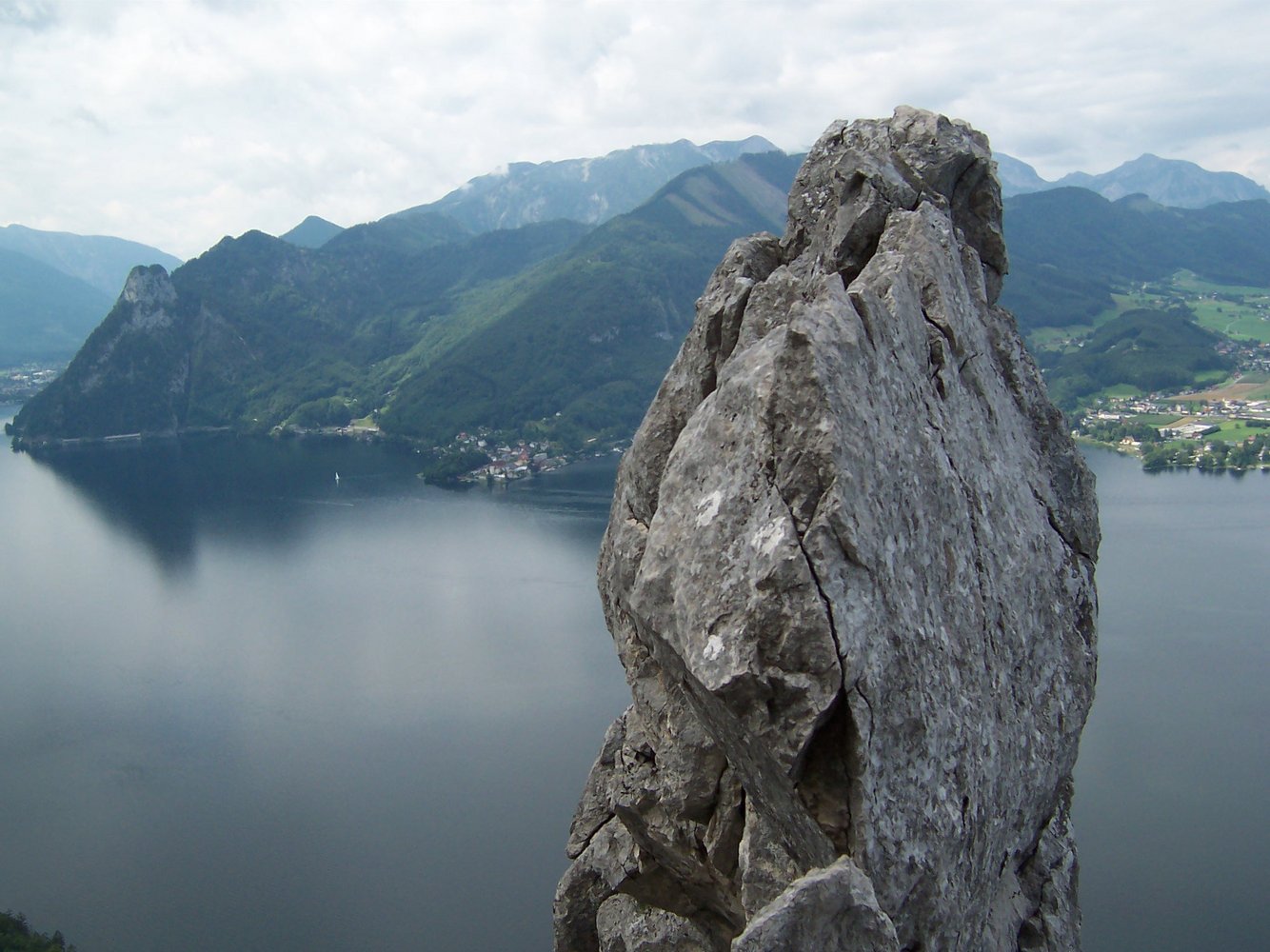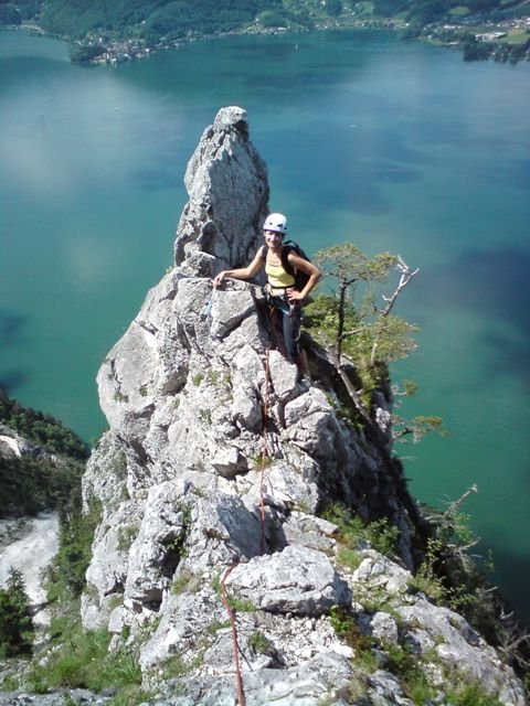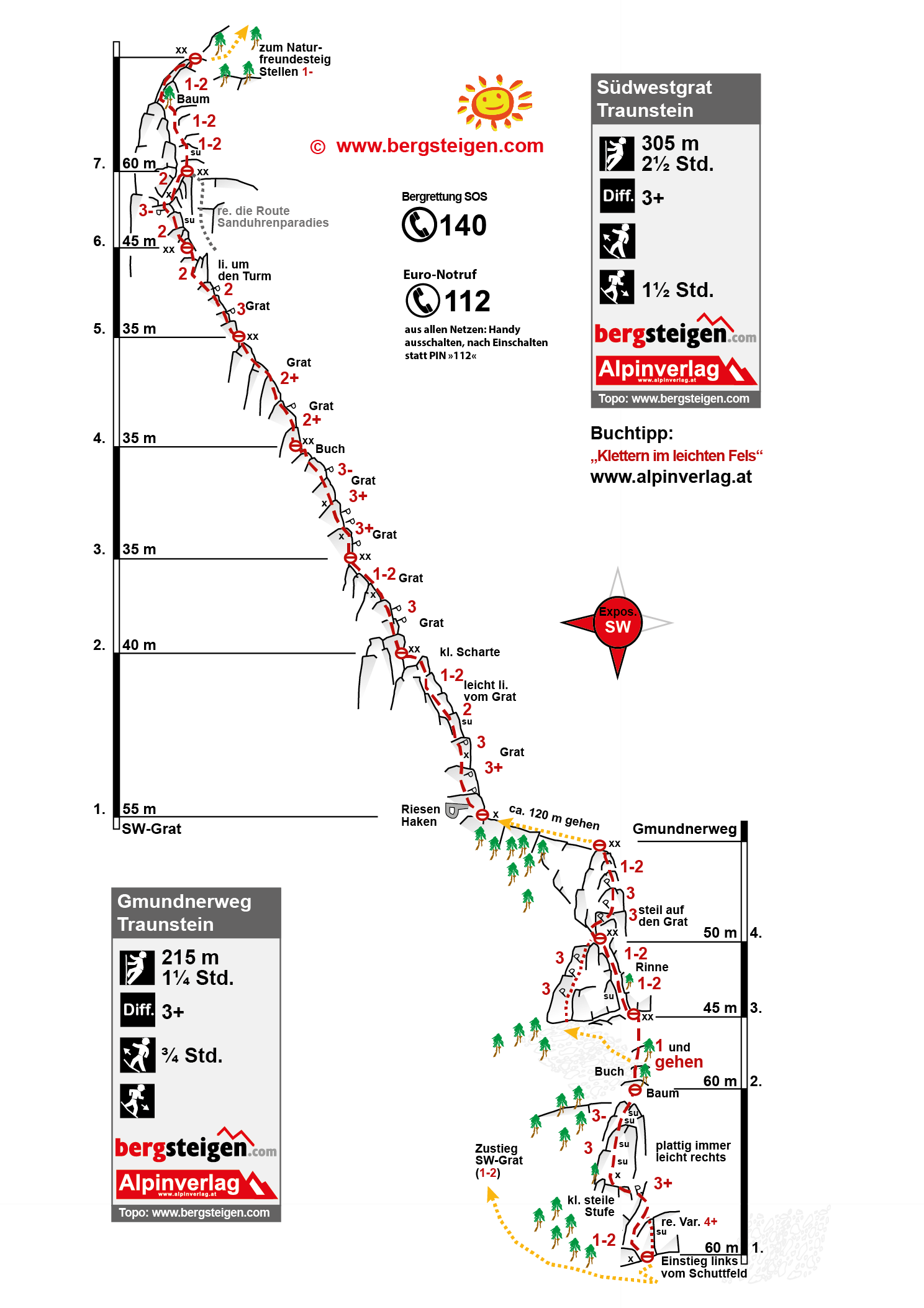 Der Aufstieg ist nicht zu unterschätzen, vor allem im Sommer kann es auf dem SW-Grat sehr heiß werden. Die Standplätze sind gebohrt, dazwischen stecken nur wenig Bohrhaken. Tipp: Man kommt sehr zeitig in der Früh, bekommt einen freien Parkplatz und kann nach dem Klettern noch baden gehen. Der Aufstieg (Naturfreundesteig) zum Traunsteinhaus dauert ab dem Ausstieg ca. 1-1½ Std..