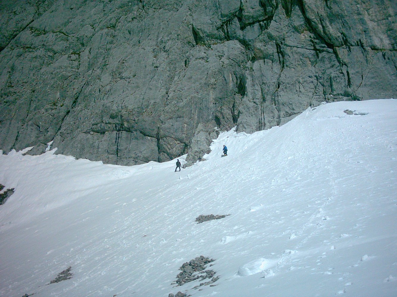 Nach links über Schotterriese unterhalb des SW-Wandrisses (R 816) bis zu einer stumpfen Kante zum tiefsten Wandpunkt waagrecht queren.