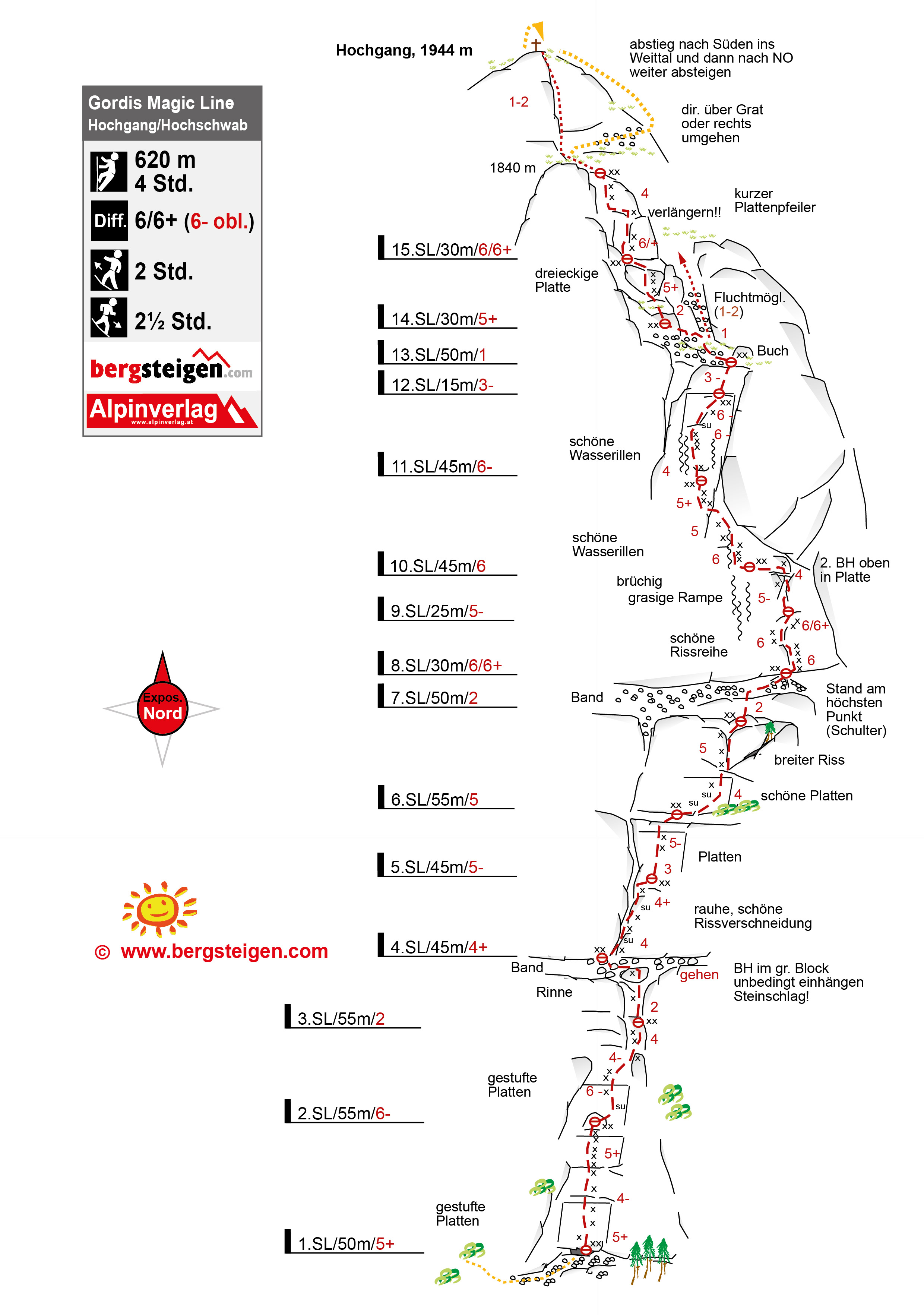 Ein Rückzug ist möglich, aber schwierig und bei Gewitter ist in der mit steingefüllten Rinnen durchsetzten Wand sicher die Hölle los, d.h. es sind absolut stabile Wetterverhältnisse erforderlich.