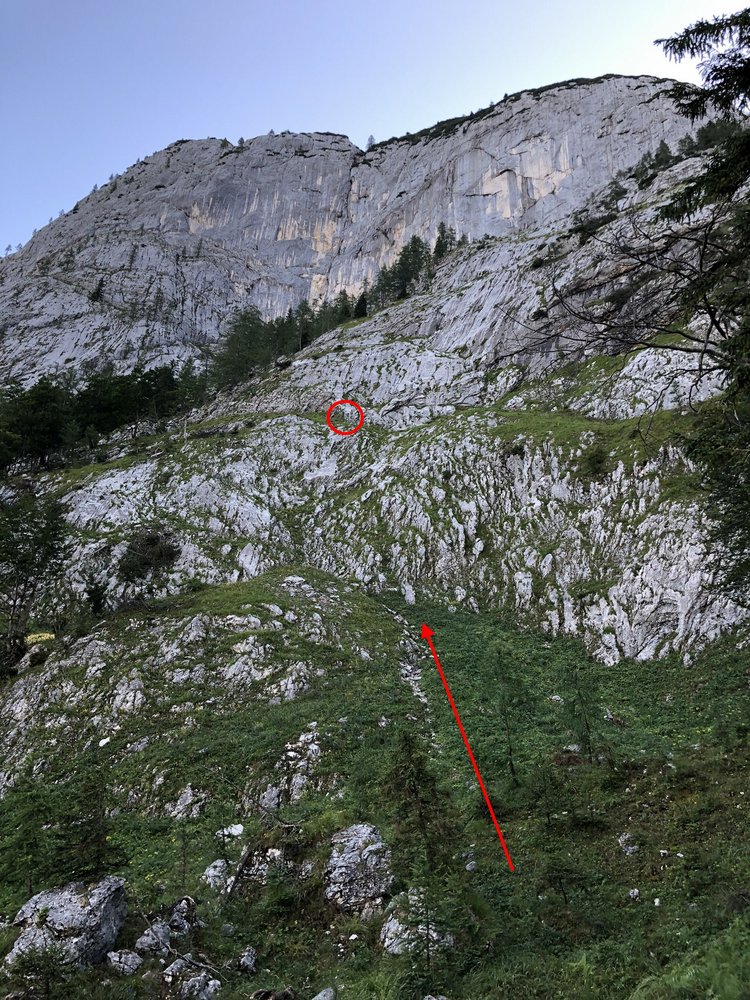 Vom Parkplatz entlang des Vorderen Gosausees, vorbei an der Gosaulacke zum Hinteren Gosausee (bis dorthin Forstweg, ein MTB wäre nützlich, Radfahren ist aber verboten). Von der Hütte (im Sommer Jausenstation) am südlichen Ufer des Hinteren Gosausees auf einer Wiese, welche oben in einem Dreieck zusammenläuft, ca 50 Meter hinauf bis zum Ende der Wiese am Waldrand. Von dort quert man nach links, leicht angsteigend in den Wald hinein und gelangt nach ca. 40 Meter auf einen unmarkierten Jägersteig, welchen man nach rechts hinauf folgt. Der Jägersteig führt nach links, aufwärts bis man zu einer freien Fläche vor dem geneigten Wandfuß kommt. Dort befindet sich auch ein klappbarer Hochstand. Von dort geht es in Schrofenkletterei zum Einstieg (Sanduhr unterhalb einer markanten Wasserrille).