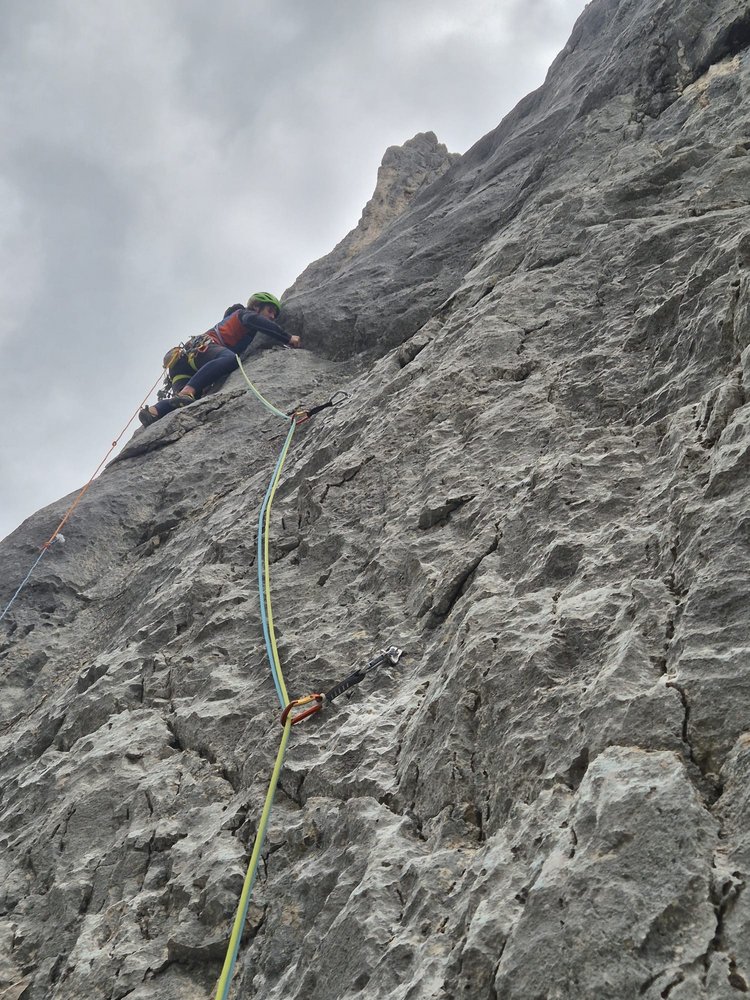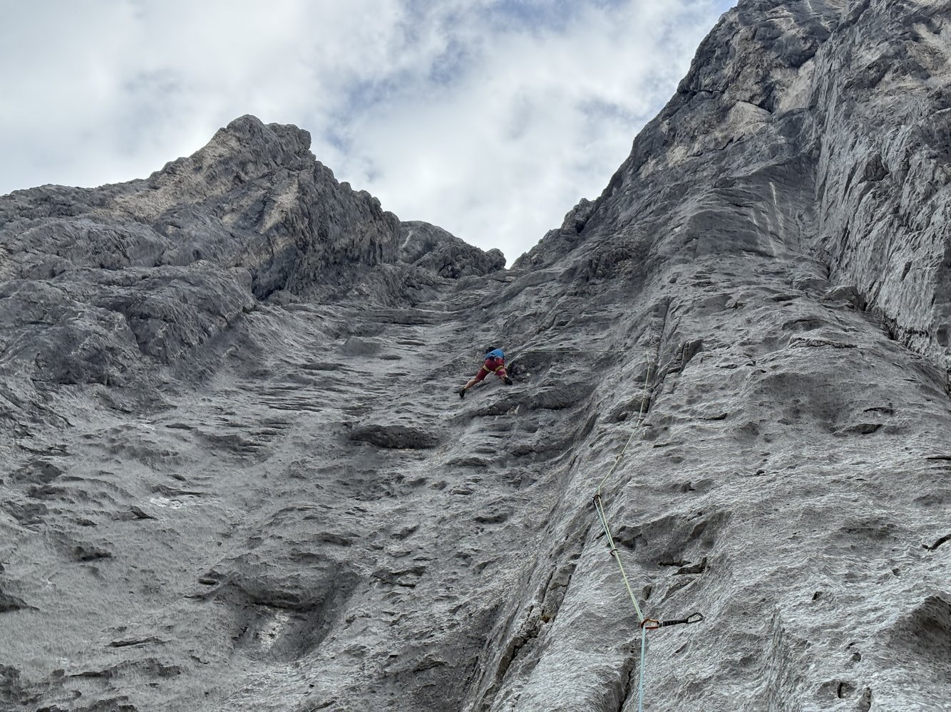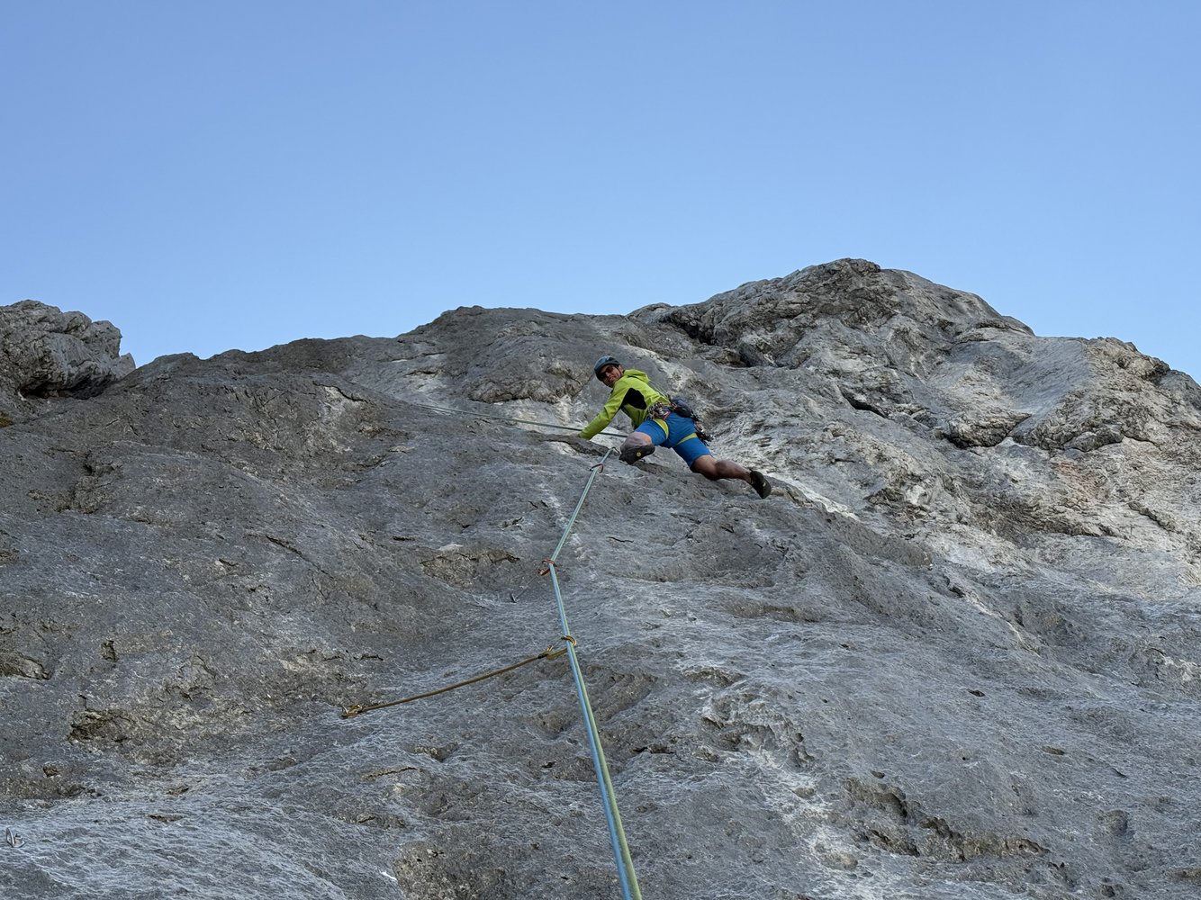 Die Schwierigkeit in der fünften Seillänge (9-; Schlüsselseillänge) beschränkt sich auf wenige Meter und kann gut A0 (8-) geklettert werden. Der siebte Schwierigkeitsgrad sollte relativ sicher beherrscht werden.