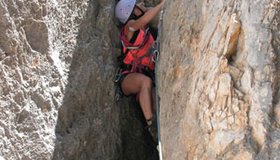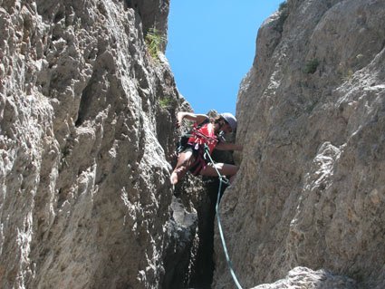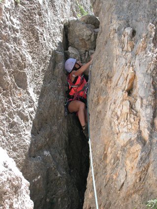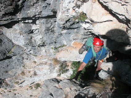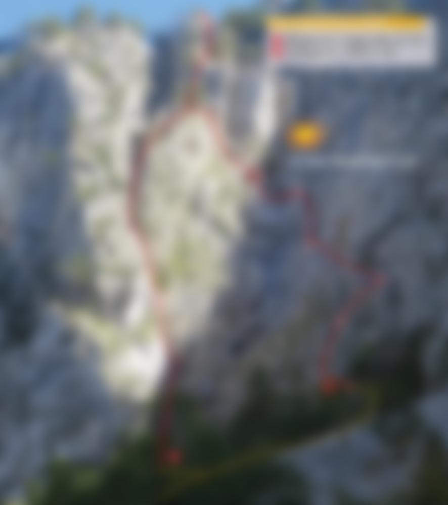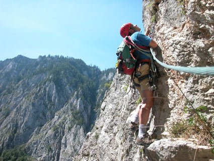 Tolle, sehr ausgesetzte Kaminkletterei in der markanten Kaminreihe links vom Akademikersteig. Luftige Kletterei, bei der man meist spreizend durch Kamine aufsteigt, oben trifft man dann auf den Akademikersteig.