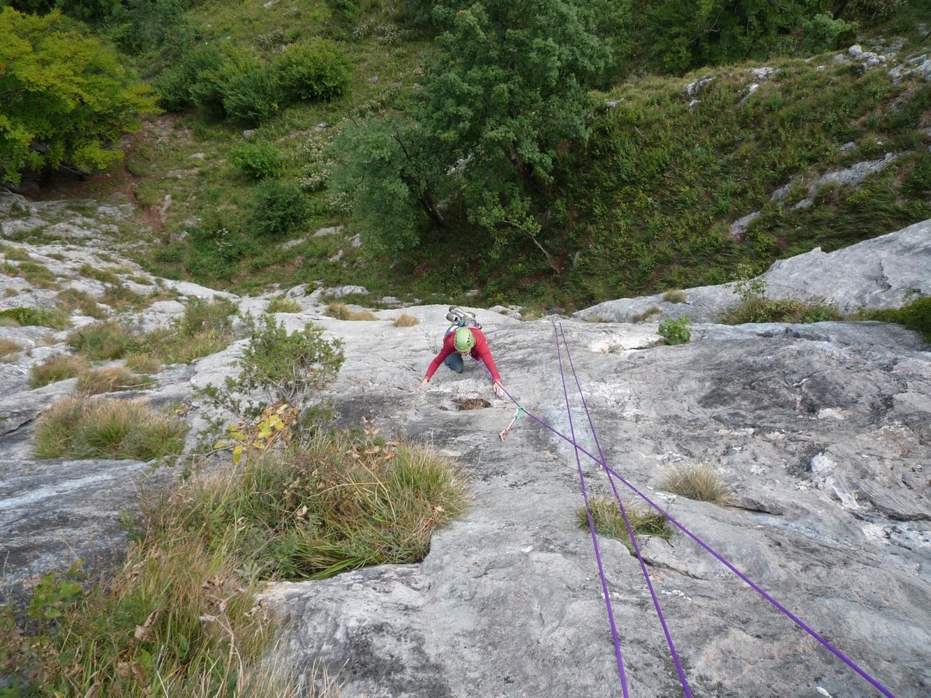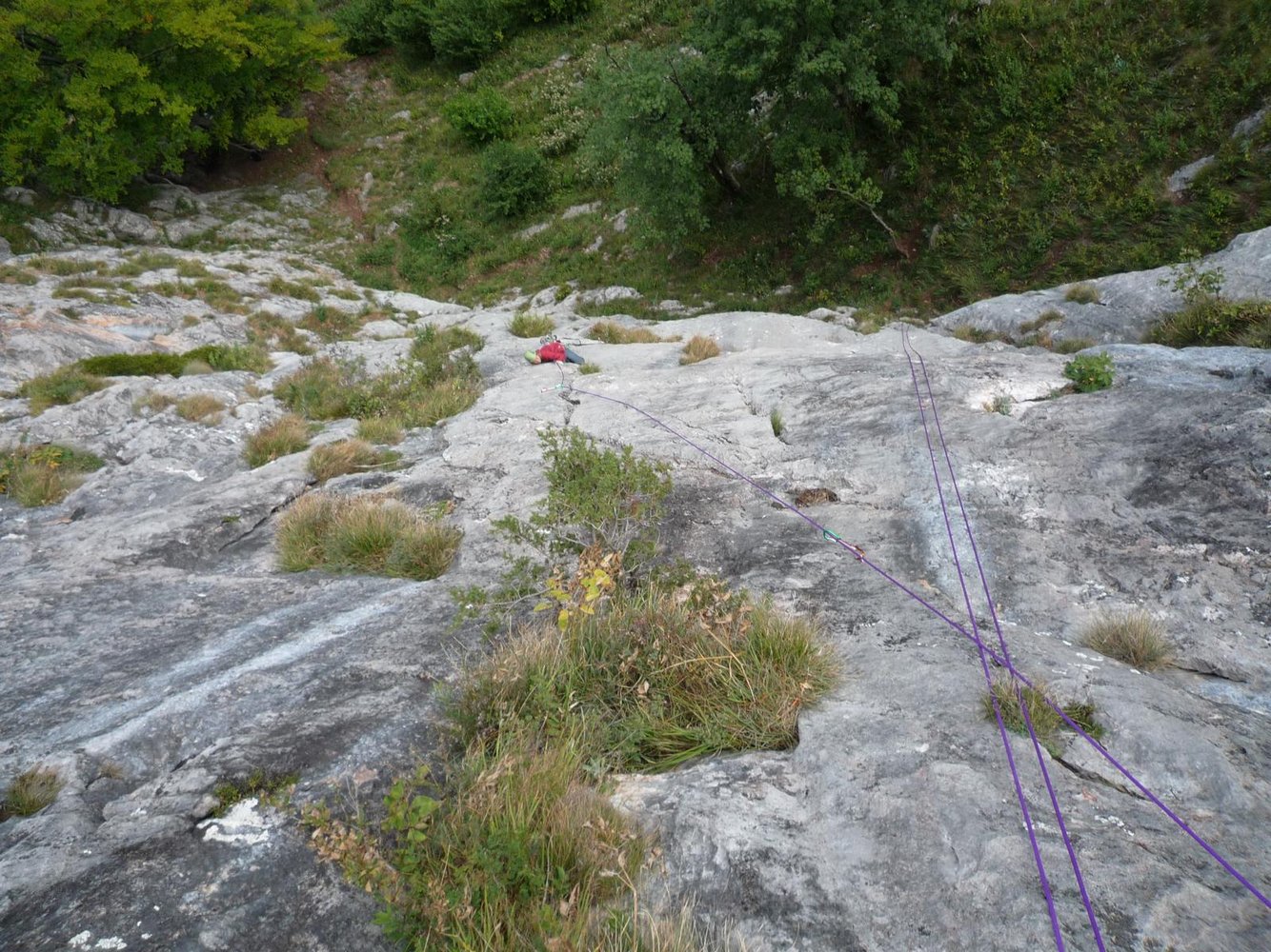 Vom Ausstieg links über einen Steig über Gipfel und entlang des Wandabbruches absteigen bis links eine schluchtartige Rinne ansetzt. Der Abstiegssteig führt über den orographisch rechten (westlichen) Felsrücken zum Wandfuß, nach links zurück zum Rucksackplatzl (1- / deutliche Begehungsspuren).