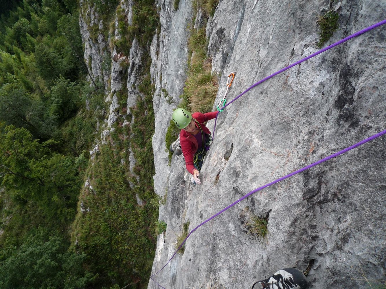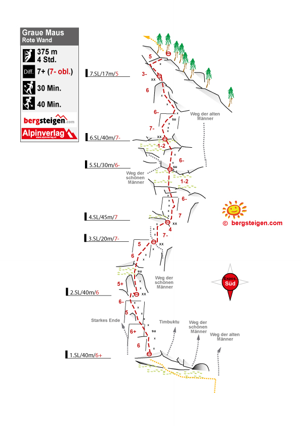Tolle Kletterei in bestem Rote Wand Fels. Die Absicherung ist aber deutlich schlechter als in den Nachbarrouten und setzt ein sicheres Beherrschen der Schwierigkeit vorraus.