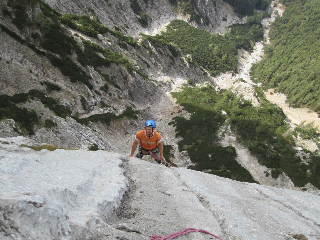 Entweder über die Route abseilen oder vom Ausstieg in Richtung Westen und über den markierten "Peternpfad" zur Haindlkarhütte und weiter ins Tal absteigen oder nach Süden zur Hesshütte.
