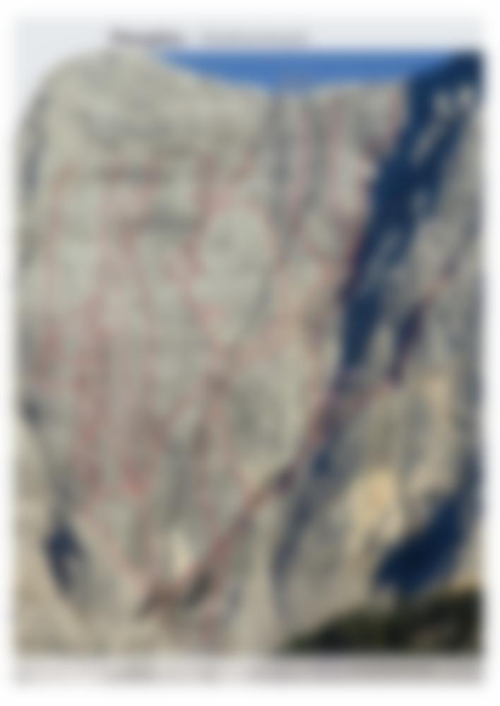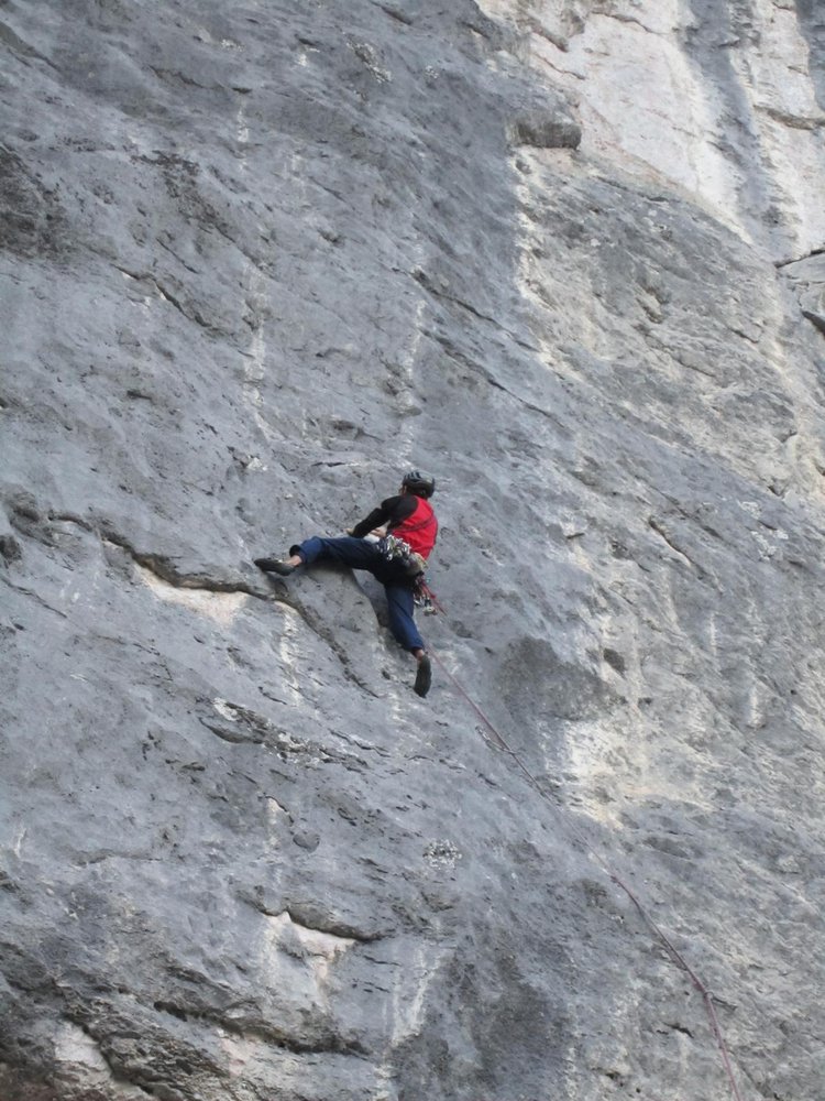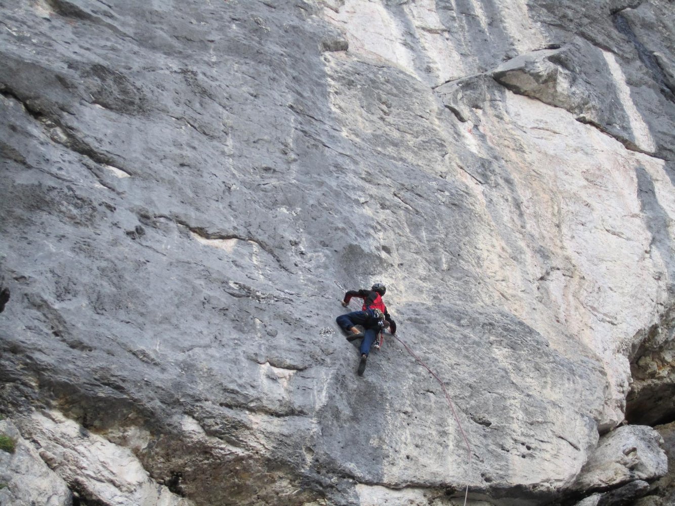 Im unteren und oberen Wanteil tolle Wankletterei. Aufgrund des leichten, etwas schrifigen Mittelteils ist die Route allergins etwas inhomogen. Vor allem die Seillängen 1, 2 und 8 zeichnen sich durch excellente Felsqualität aus. in der 1. und 8. SL ist wegen der kleinen Strukturen gutes Schuhwerk gefragt.