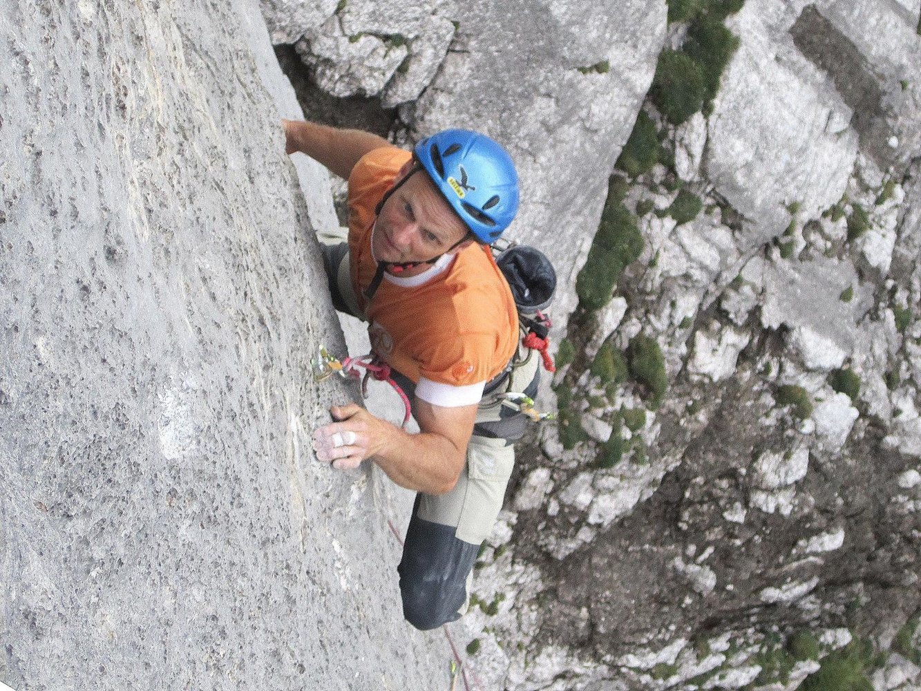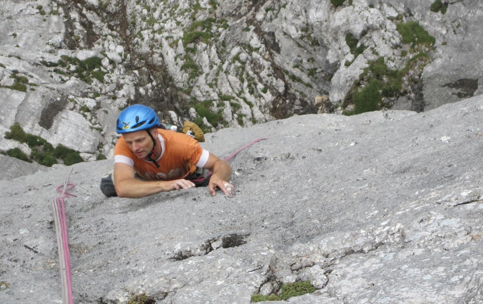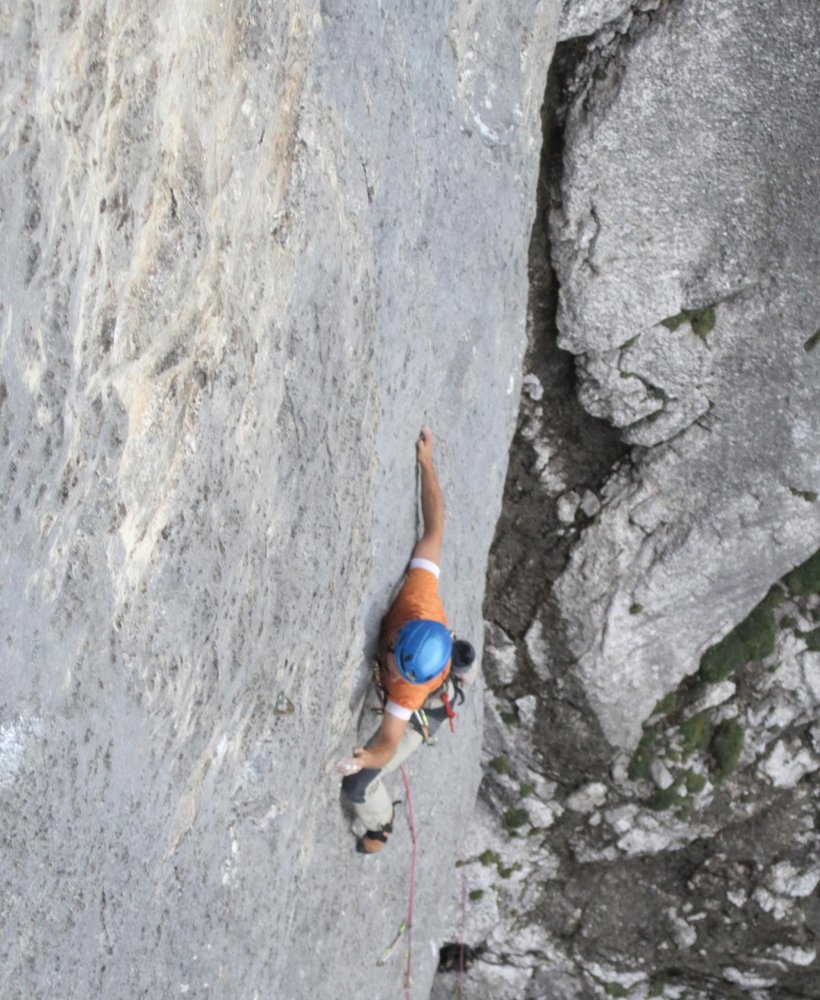 Gute Absicherung mittels Bohrhaken und Camalots (Friends). Manchmal auch etwas größere Abstände.
