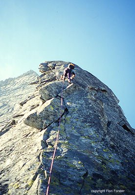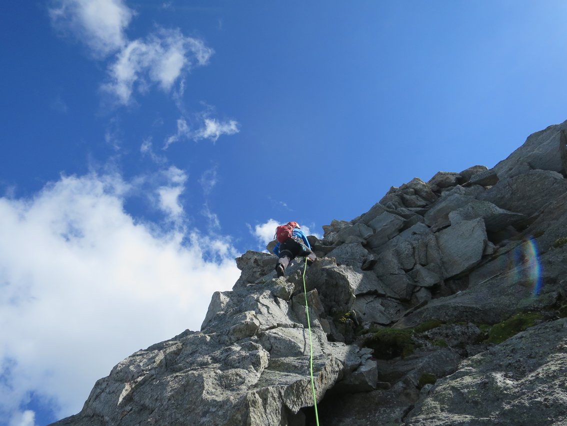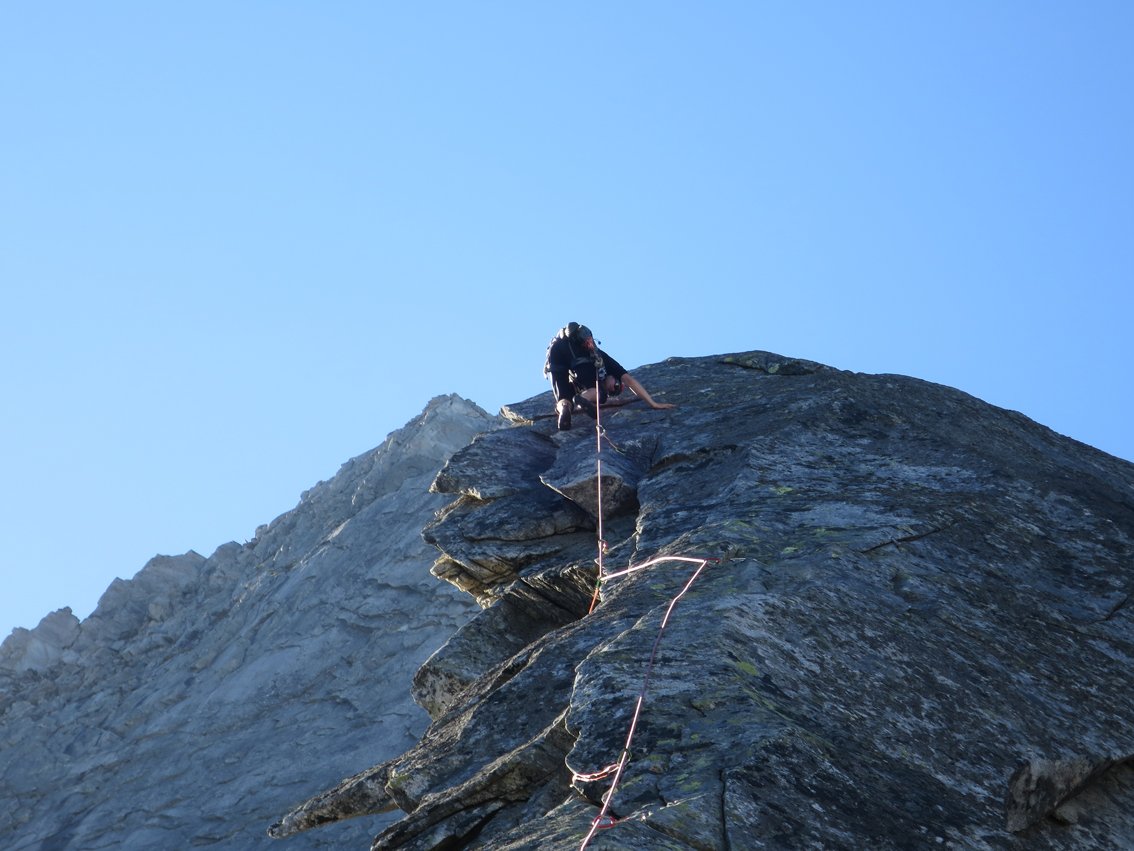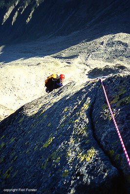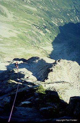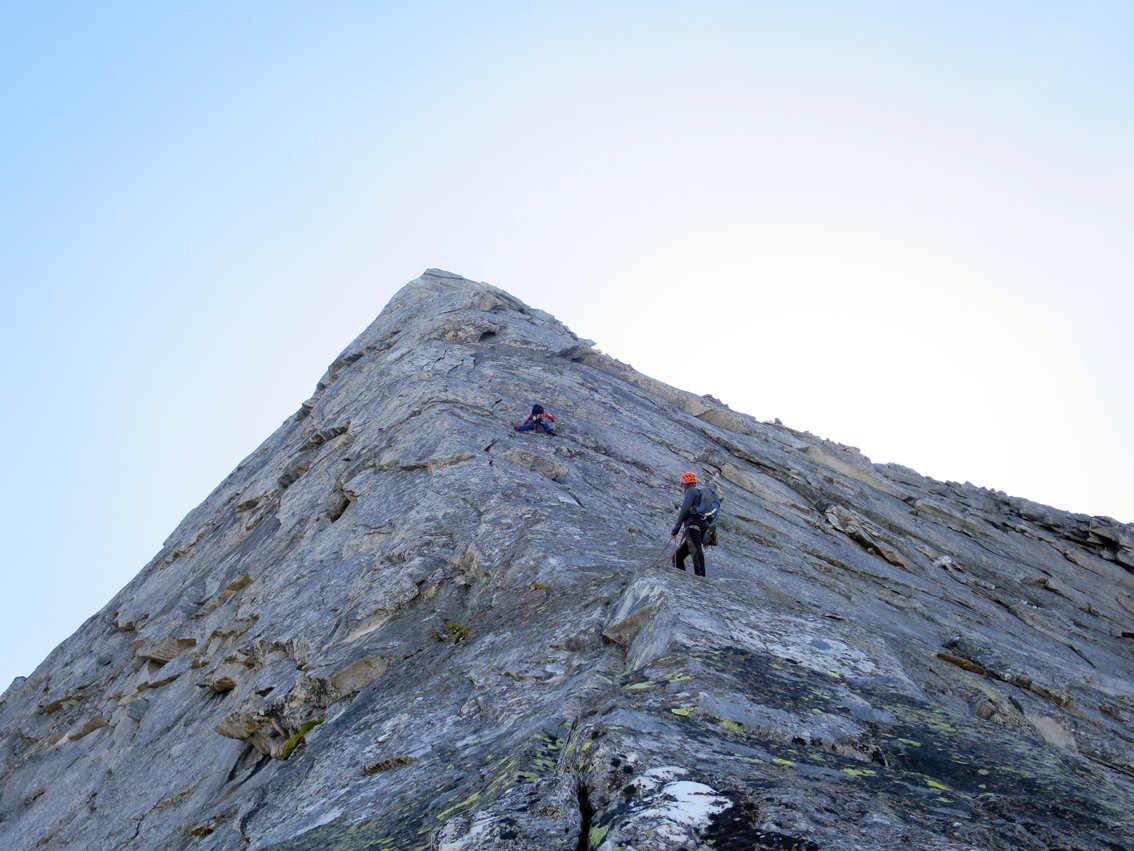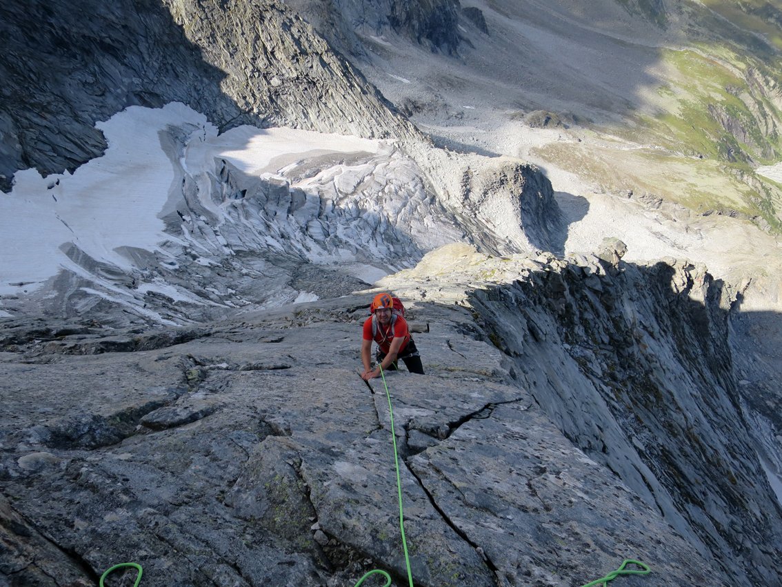 Ein Rückzug ist nach der Kantenmitte nicht zu empfehlen (einige waagrechte und nicht sehr steile Passagen, sehr schlecht zum Abseilen).
