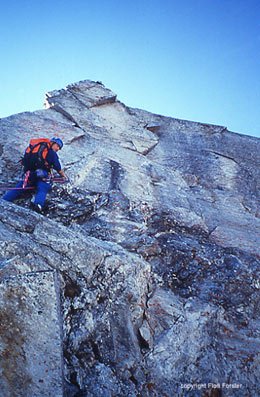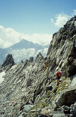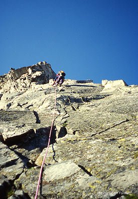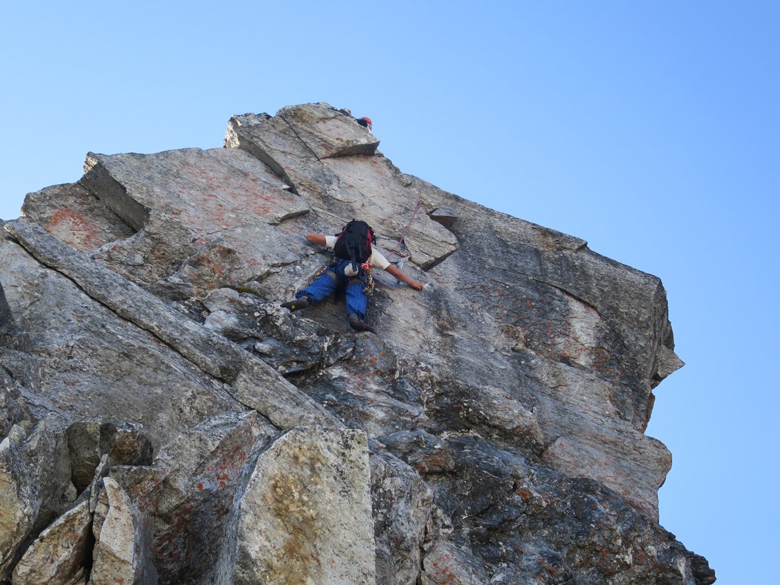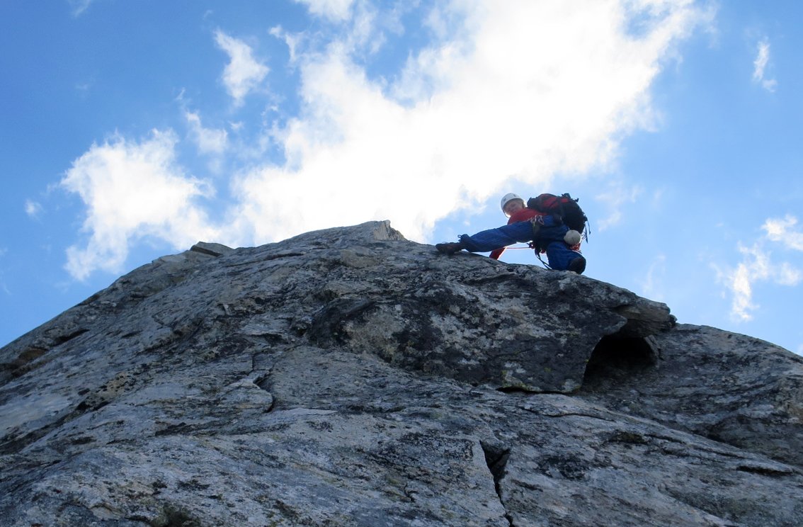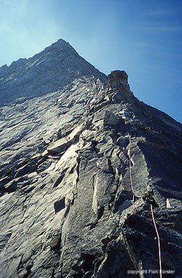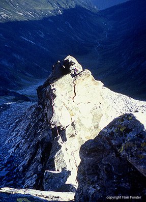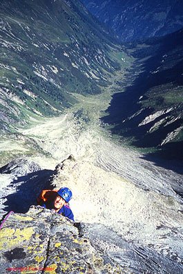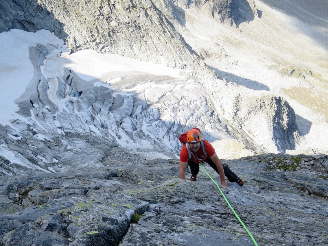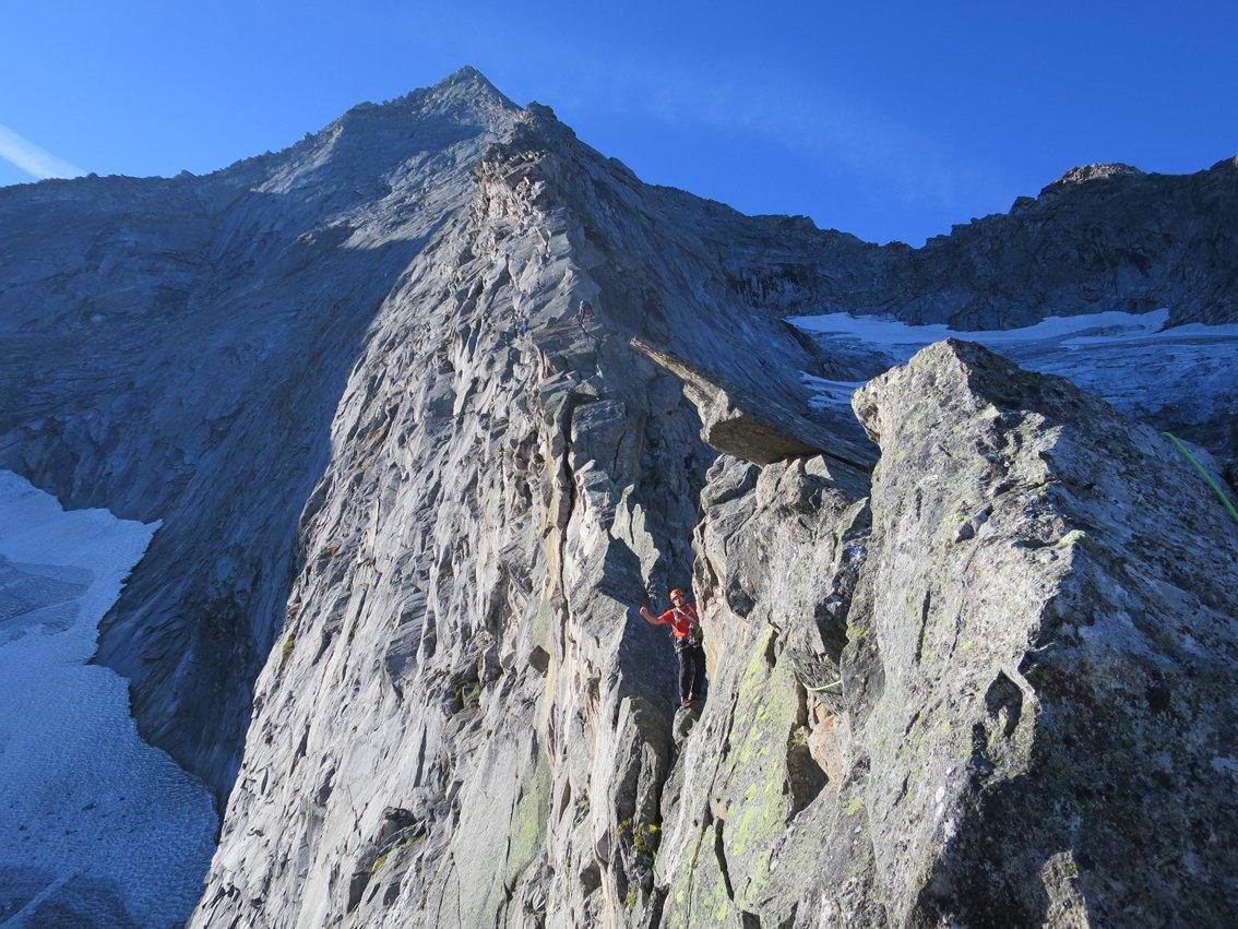 Ein Rückzug ist nach der Kantenmitte nicht zu empfehlen (einige waagrechte und nicht sehr steile Passagen, sehr schlecht zum Abseilen).