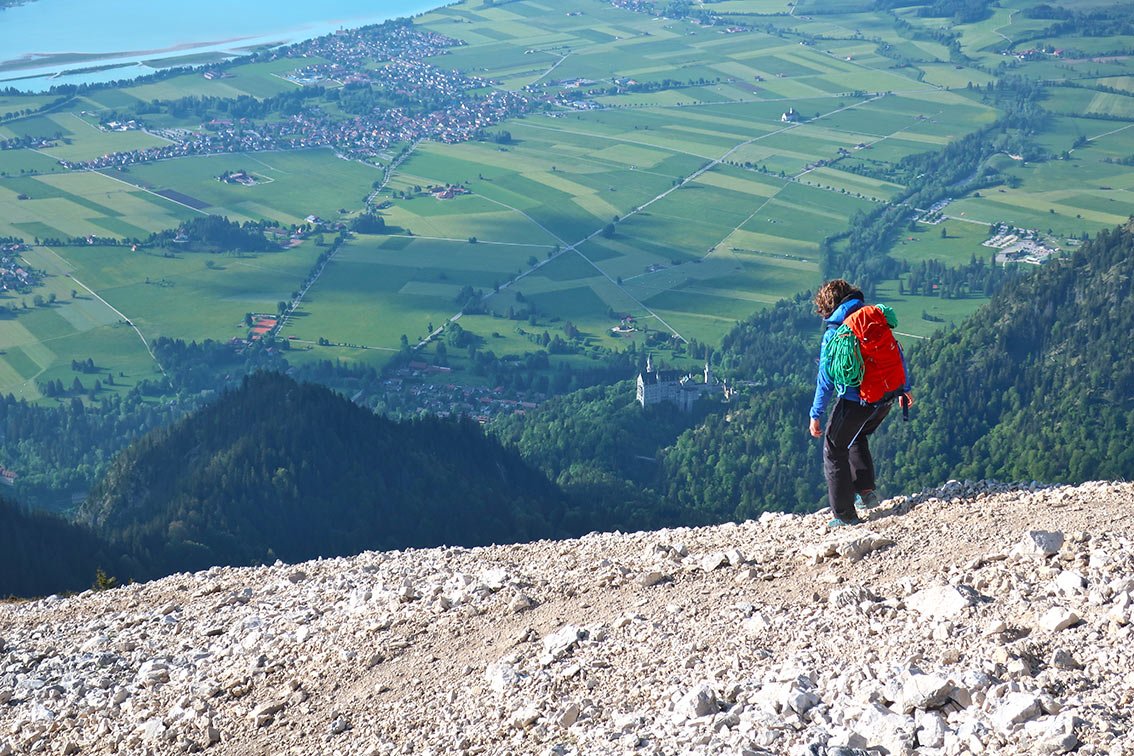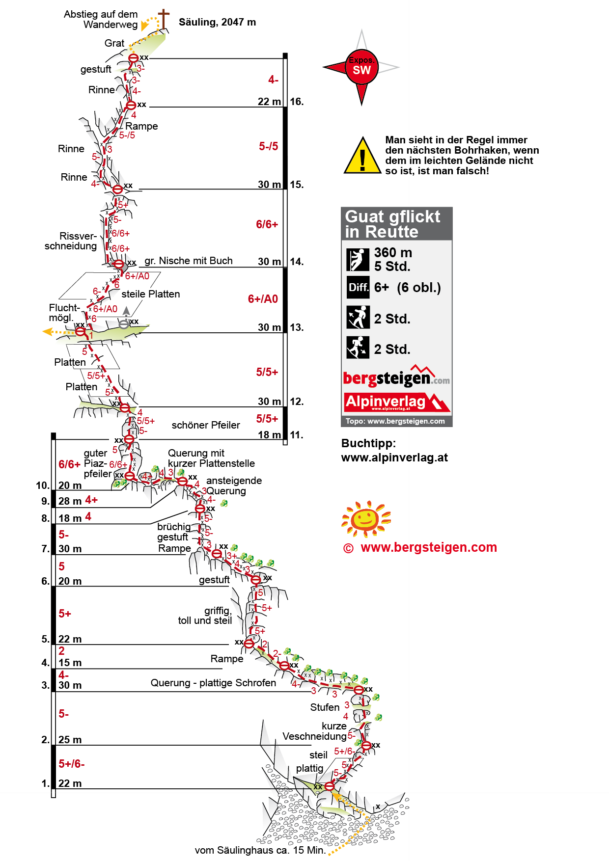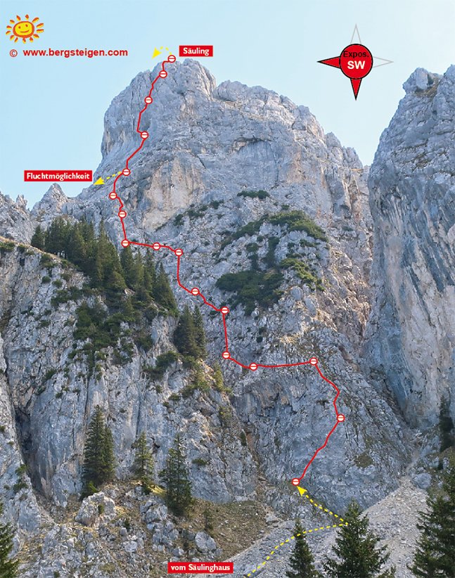 Die Route ist an sich nichts Besonderes - aber das Gesamtpaket aus Kletterei, Gipfelerlebnis und Landschaft kann fast nicht überboten werden. Die Route wurde geschickt entlang der Westwand des Säulings errichtet, unten muss man mehrmals queren, als Entschädigung dafür folgt oben eine gewaltige Headwall. Ausgestiegen wird direkt beim Gipfelkreuz - von dort hat man einen perfekten Ausblick auf das Märchenschloss Neuschwanstein und die dahinter liegende Seenlandschaft. Gesamt ein imposantes Klettererlebnis, das durch die üppige Bohrhakensicherung, für schwächere Nachsteiger nicht zur Qual wird.