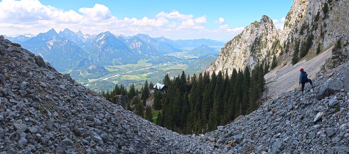 Vom Ende der Kletterei auf dem Grat zum Hauptgipfel mit dem Gipfelkreuz. Dann auf dem gut ausgetretenen Wanderweg nördlich hinunter zu einem flachen Sattel. Dort links, steil (Stahlseilsicherung) nach unten zum Säulinghaus und auf dem Hüttenzustiegsweg weiter zum Parkplatz.