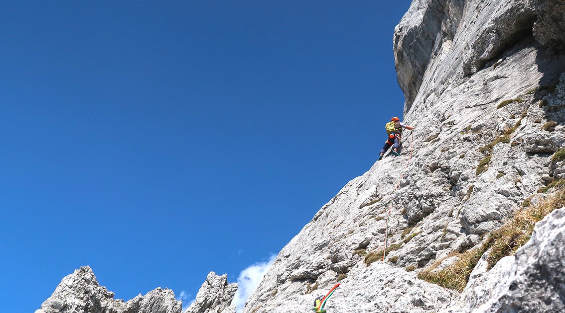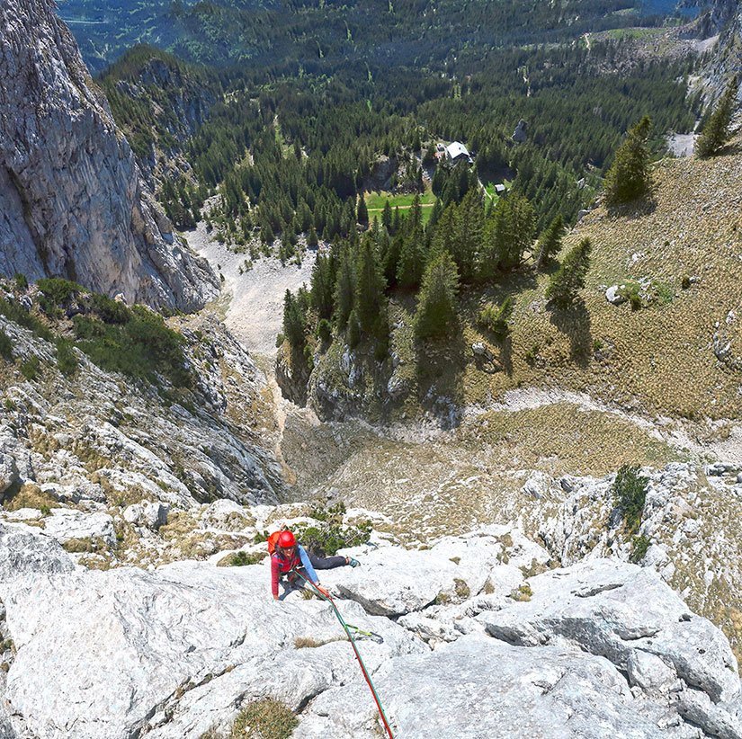 Nach Regenfällen einen trockenen Tag abwarten. Die Wandzone oberhalb der ersten 4 Seillängen ist bei Gämsen recht beliebt - große Steinschlaggefahr! Nach der 11. Seillänge kann man links über Schrofen zum Wanderweg ausqueren.