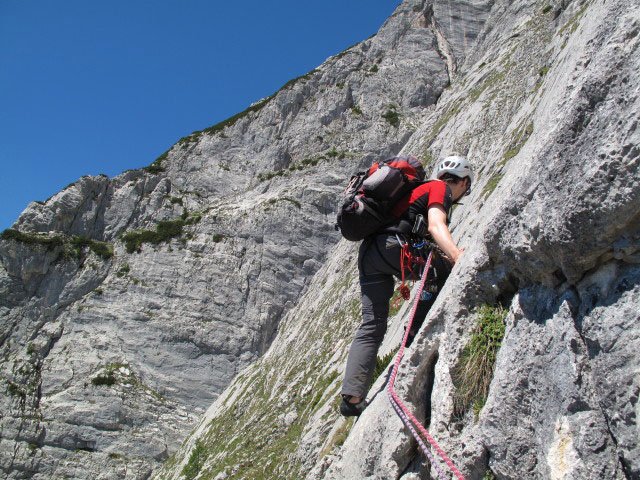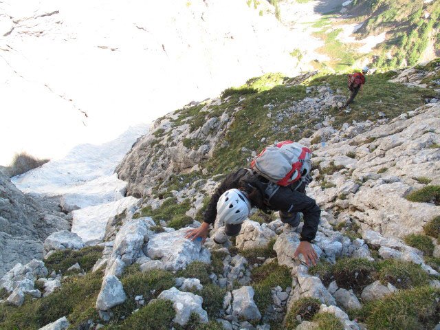 Vom Ausstieg über die sogenannte "Blaue Markierung" im äußerst unangenehmen Steilgelände (zuerst Schrofen, später brüchige Rinnen, fast ausschließlich Klettergelände bis 2+) zum Aufstiegsweg absteigen und über diesen zurück ins Tal.