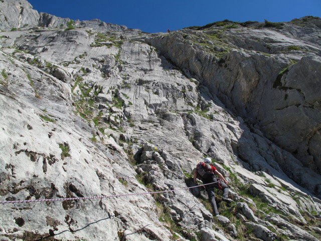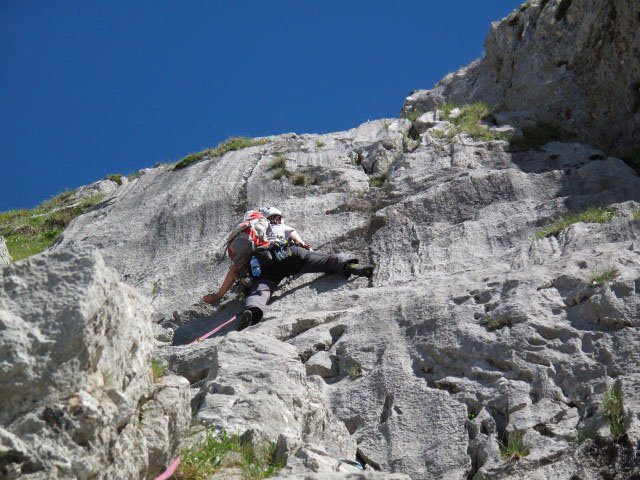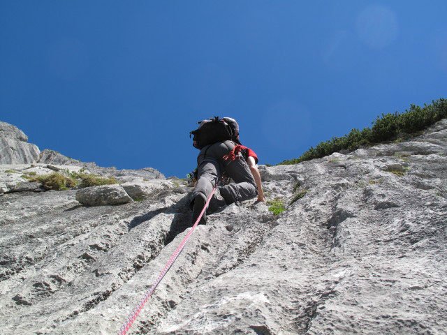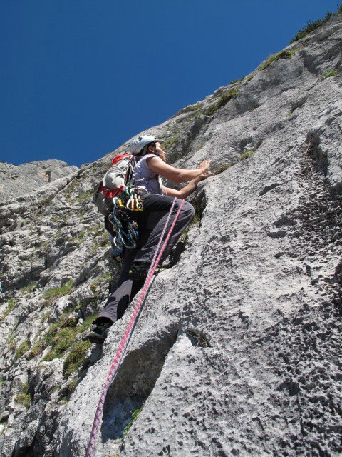 Nach den zwei steilen Einstiegsseillängen über Platten (4) folgt eine grasige Schrofenquerung nach rechts (1). Steil hinauf (4+) zur Abzweigung der Routen "Sendero Luminoso" und "Waidhofnerweg", wo man sich immer rechts hält (3 und 2) und im schrofigen Gelände auf den "Direkten Gummikiller" trifft. Steil hinauf (kurzer Überhang) geht es (2 bis 4+) zu einer Ansammlung von Latschen. Nach zwei Seillängen ansteigender Rechtsquerung (3 und 4-) folgt ein Steilaufschwung (4), wo der "Direkte Gummikiller" links abzweigt. Man quert jedoch ansteigend nach rechts (4+) und klettert die Ausstiegsseillängen gerade hinauf (4 und 3+).