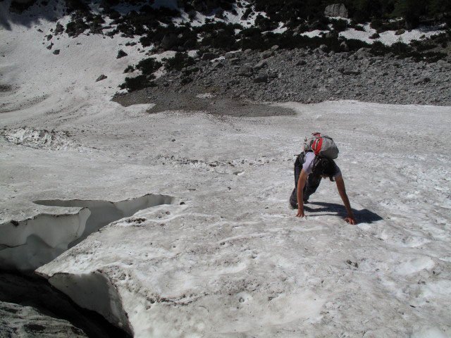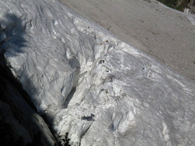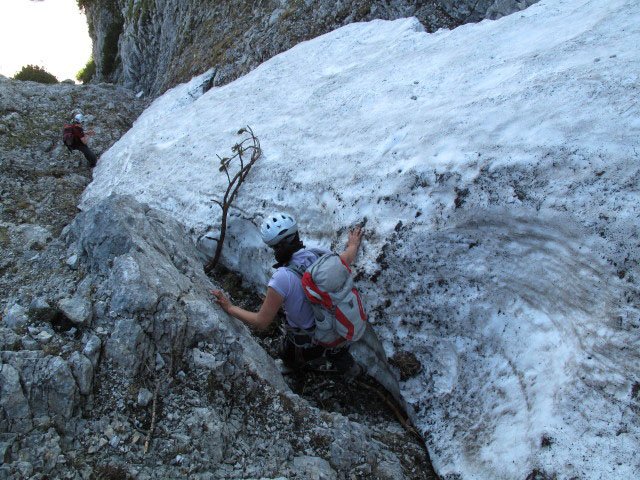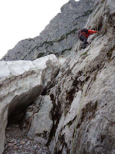 Am Wandfuss ist sowohl beim Einstieg, als auch beim Abstieg ein bis weit in den Sommer hinein vorhandenes, steiles Schneefeld zu überwinden (evtl. Randkluft).