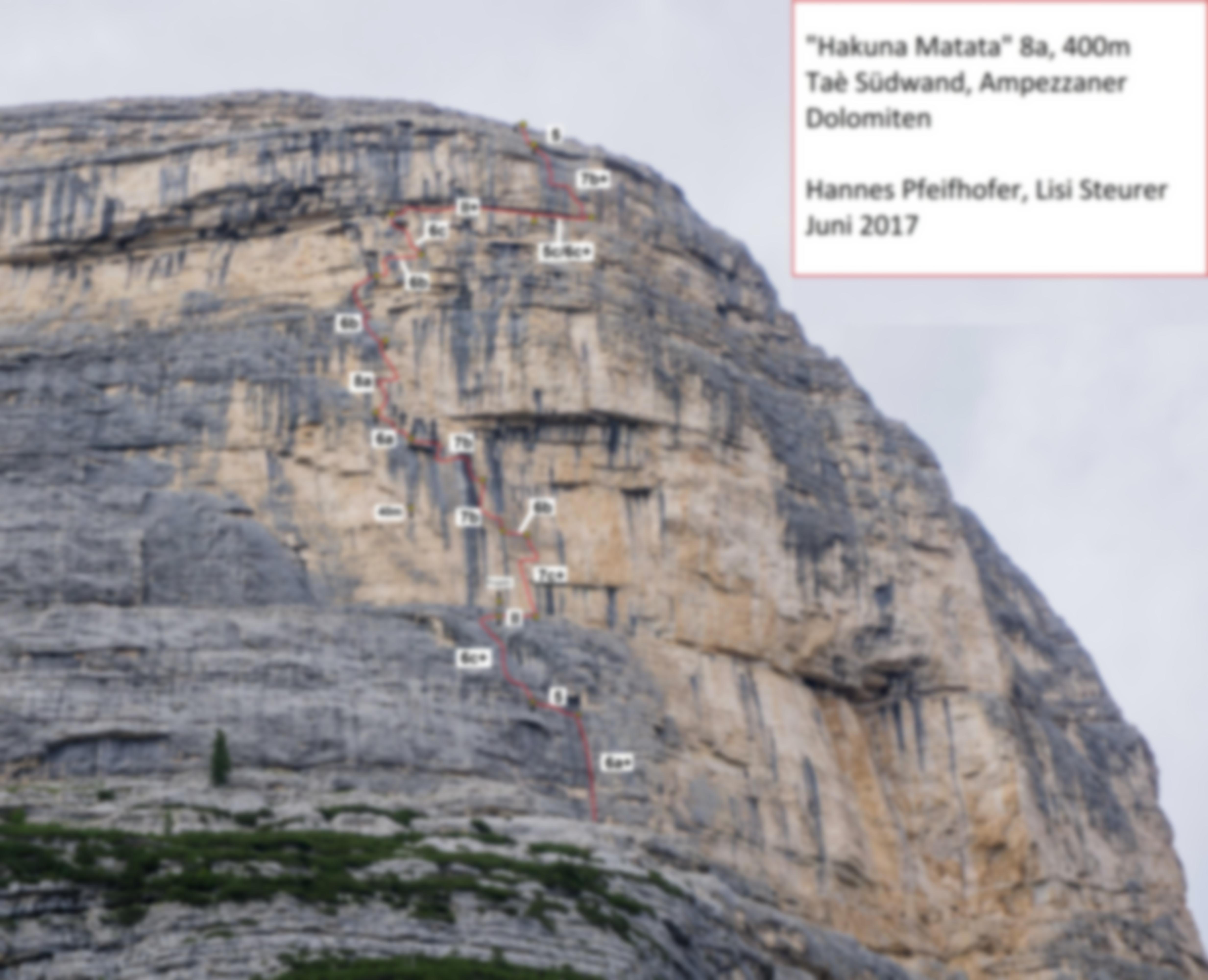 Insgesamt folgt die Route einer „logischen“ Linie durch den zentralen Wandteil des Taè und beinhaltet einige Quergänge. Die Stände sind bequem auf Bändern und dazwischen muss in technisch anspuchsvoller Kletterei bis 8a (Bewertungsvorschlag) geklettert werden. Die Route erfordert den obliga-torischen Grad 7b. Ein Highlight neben der ersten und der Schlüsselseillänge ist die Ausstiegsplatte à la Verdon.