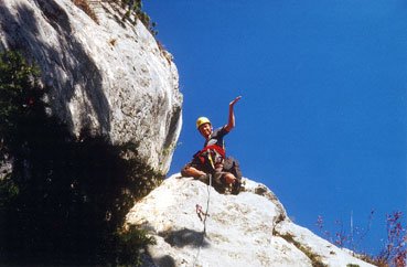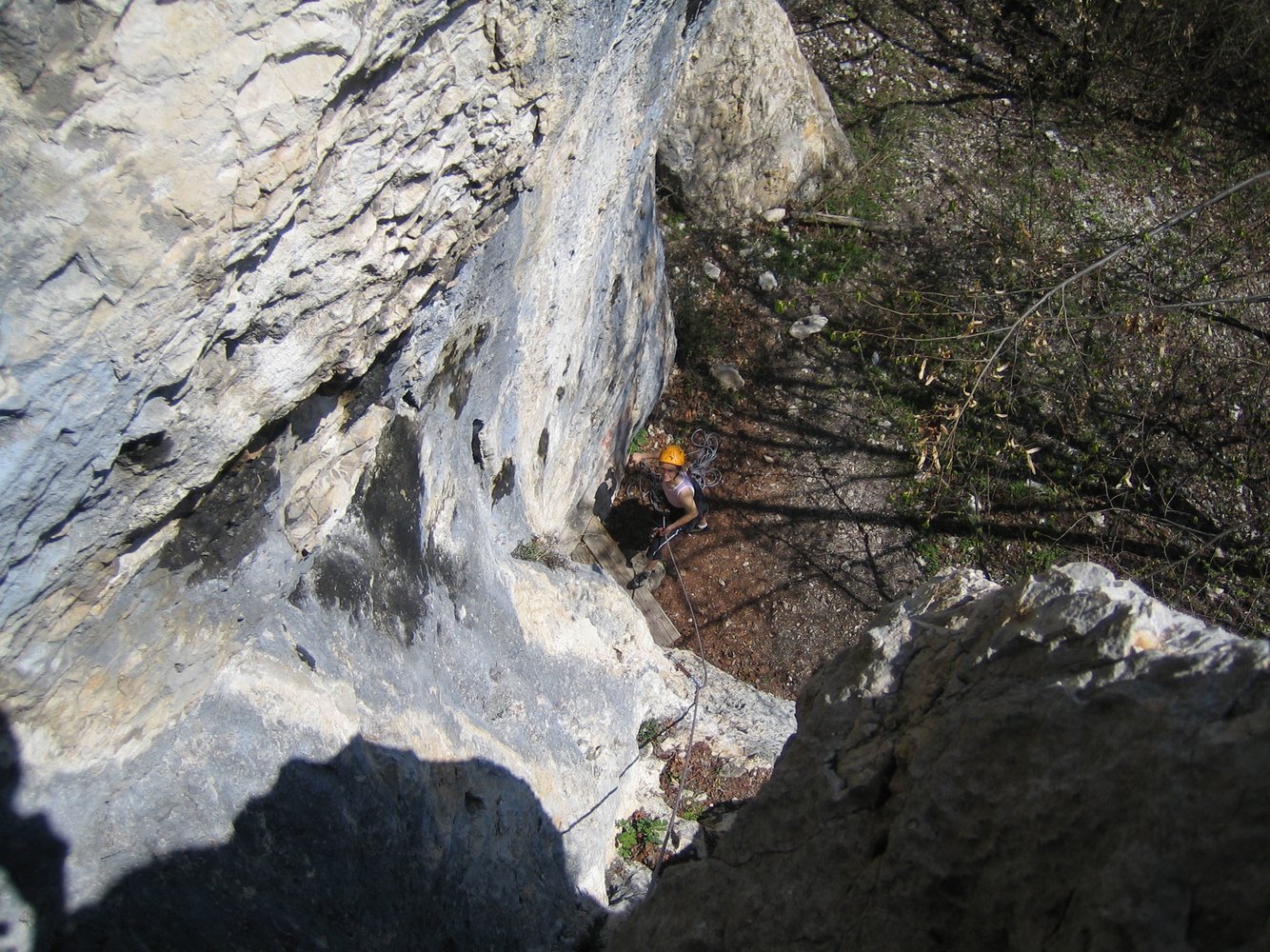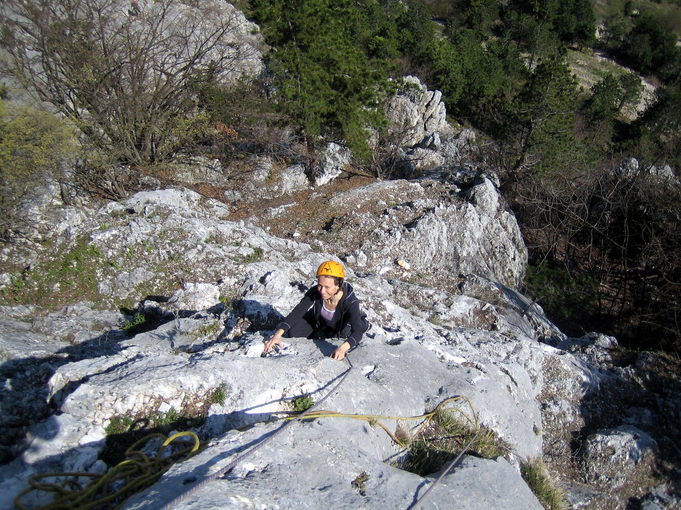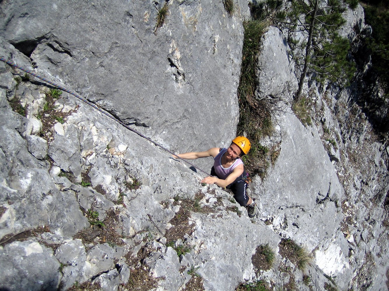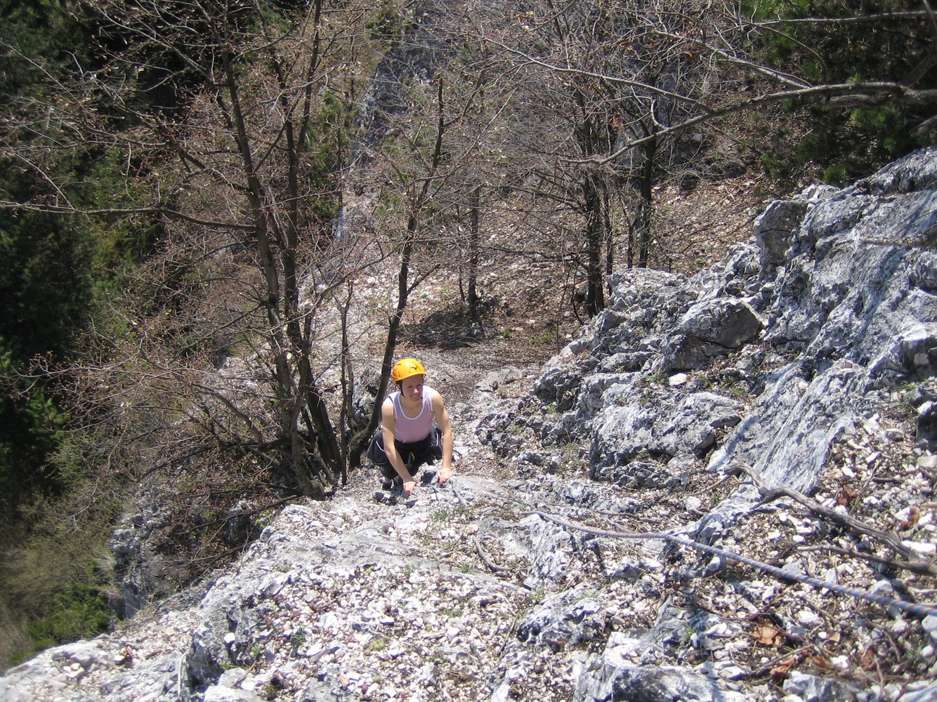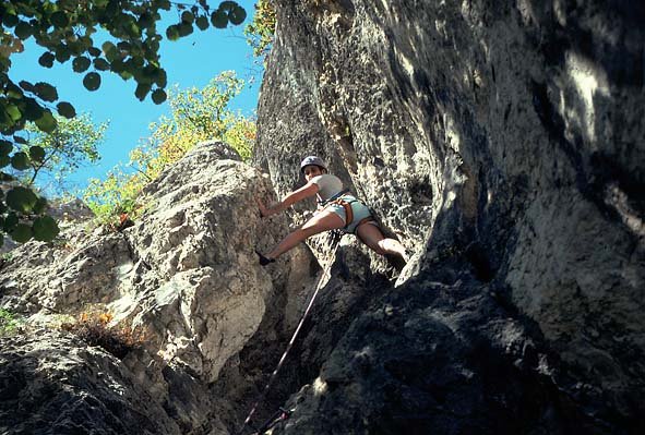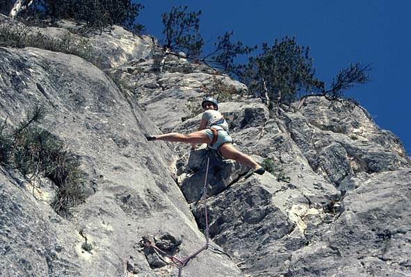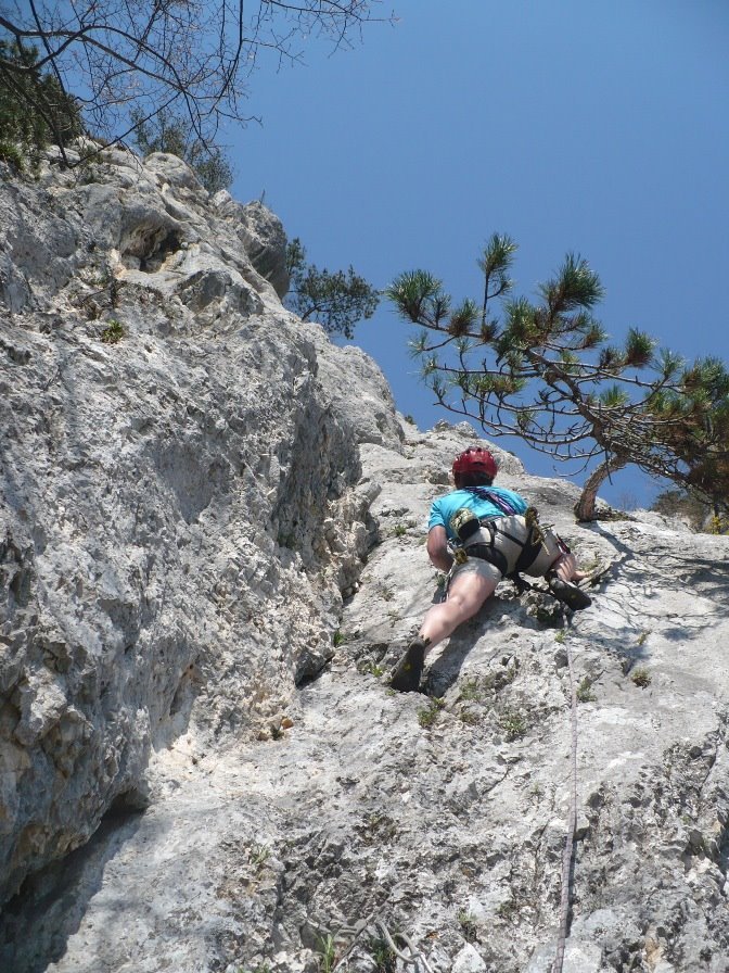 Endlich! Eine erfreuliche Alternative zu den vielbegangenen mittelschweren Anstiegen auf die Hohe Wand! Die schöne, sehr, sehr gut abgesicherte Genusskletterei, verläuft im Orignial durch einen kurzen höhlenartigen Kamin, über eine sehr schöne, steile Verschneidung, ueber eine Rampe und via Verschneidungspassage und Wandkletterei den Pfeiler empor, zu einer Querung eines Überhanges (Schlüsselstelle VI oder V/A0). Einziger Wermutstropfen: 2 Querungen (15 m und 10 m in der 2. und 5. Sl.) durch erdige Schroffen. Aber dennoch eine sehr lohnende Route durch festen Fels, die aufgrund der vielen NH & BH ideal zum Üben des Vorstiegs ist. Am Ende der Tour entsteht der Wunsch: "Mehr vom Selben".