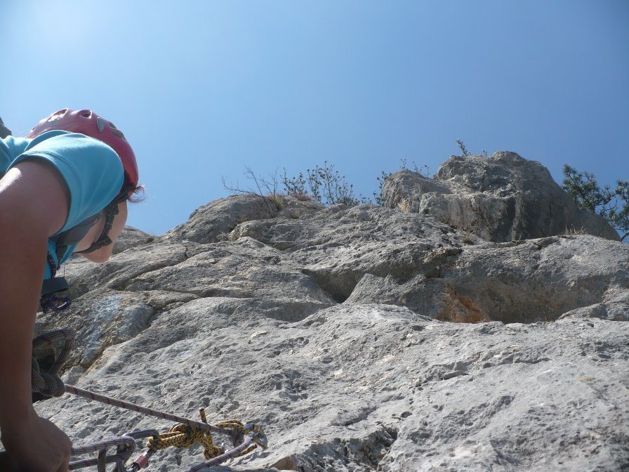 2018 ist eine neue Einstiegsseillänge dazugekommen, durch die der unschöne Quergang in der 2. Seillänge umgangen wird (5+, siehe Topo!).