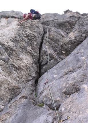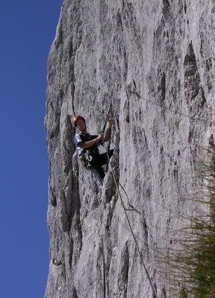Über die Tour abseilen oder (etwas schneller oder mit Einfachseil): Vom Gratturm nach Norden in markante Scharte mit Klemmblock abklettern (2 - 3) und durch den Matejak-Kamin nach Osten abseilen (Ringhaken 20 m Abstand).