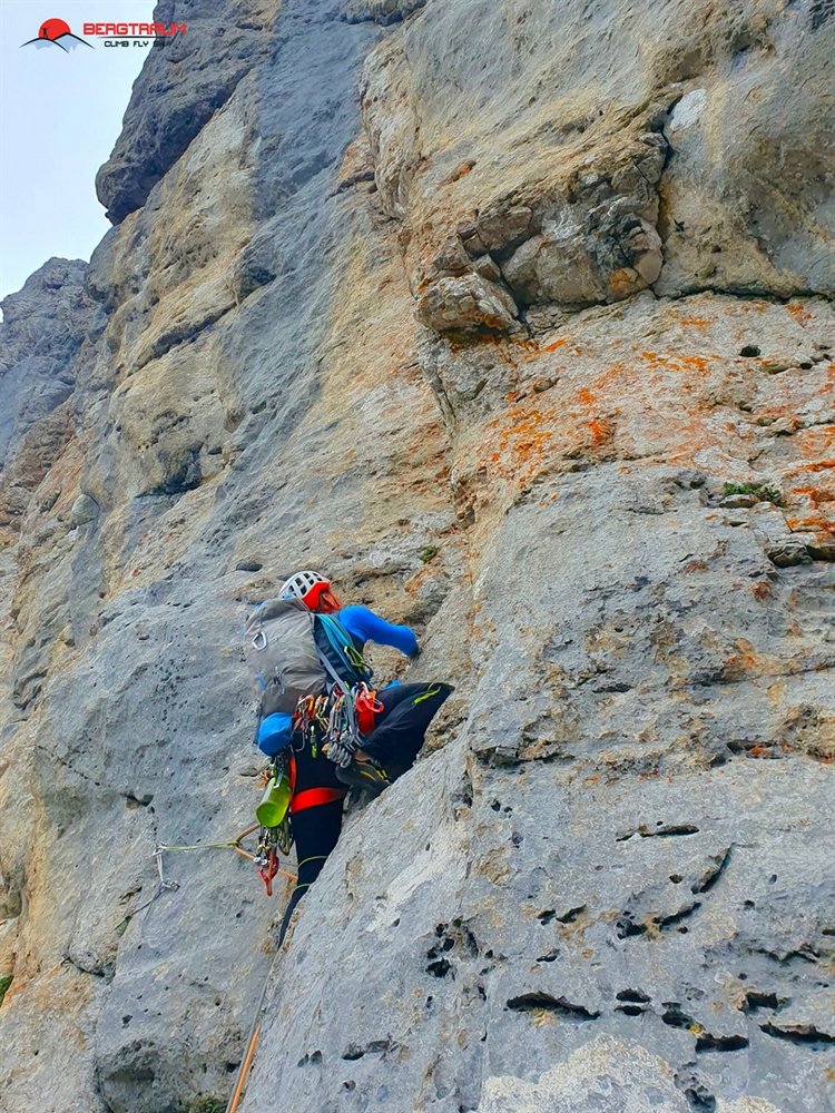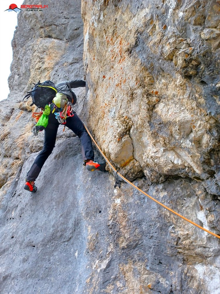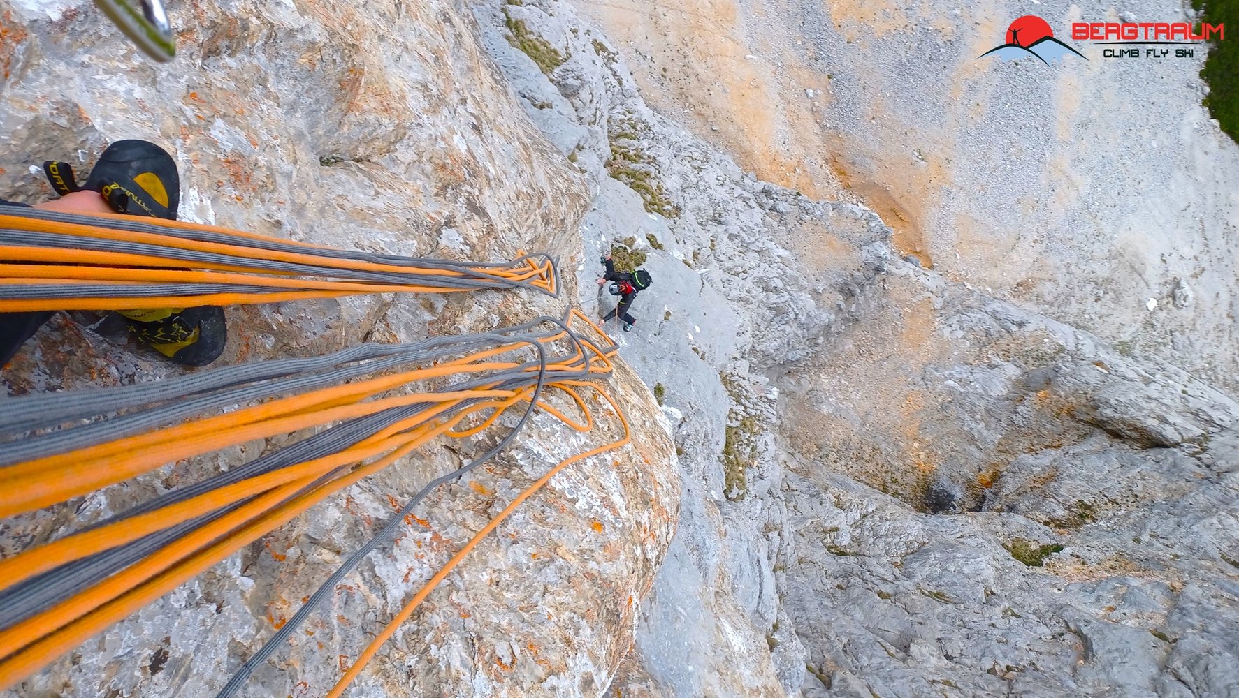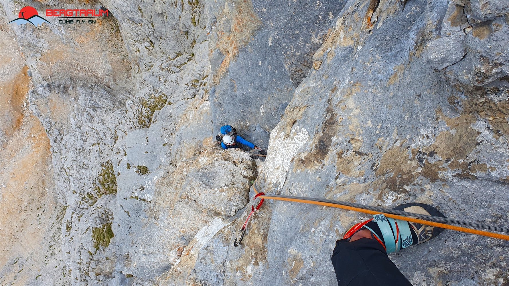 Anhaltende Schwierigkeiten von der dritten bis zur sechsten Seillänge. Die Schlüssellänge (5. SL) ist für Sportkletterer schlecht gesichert.